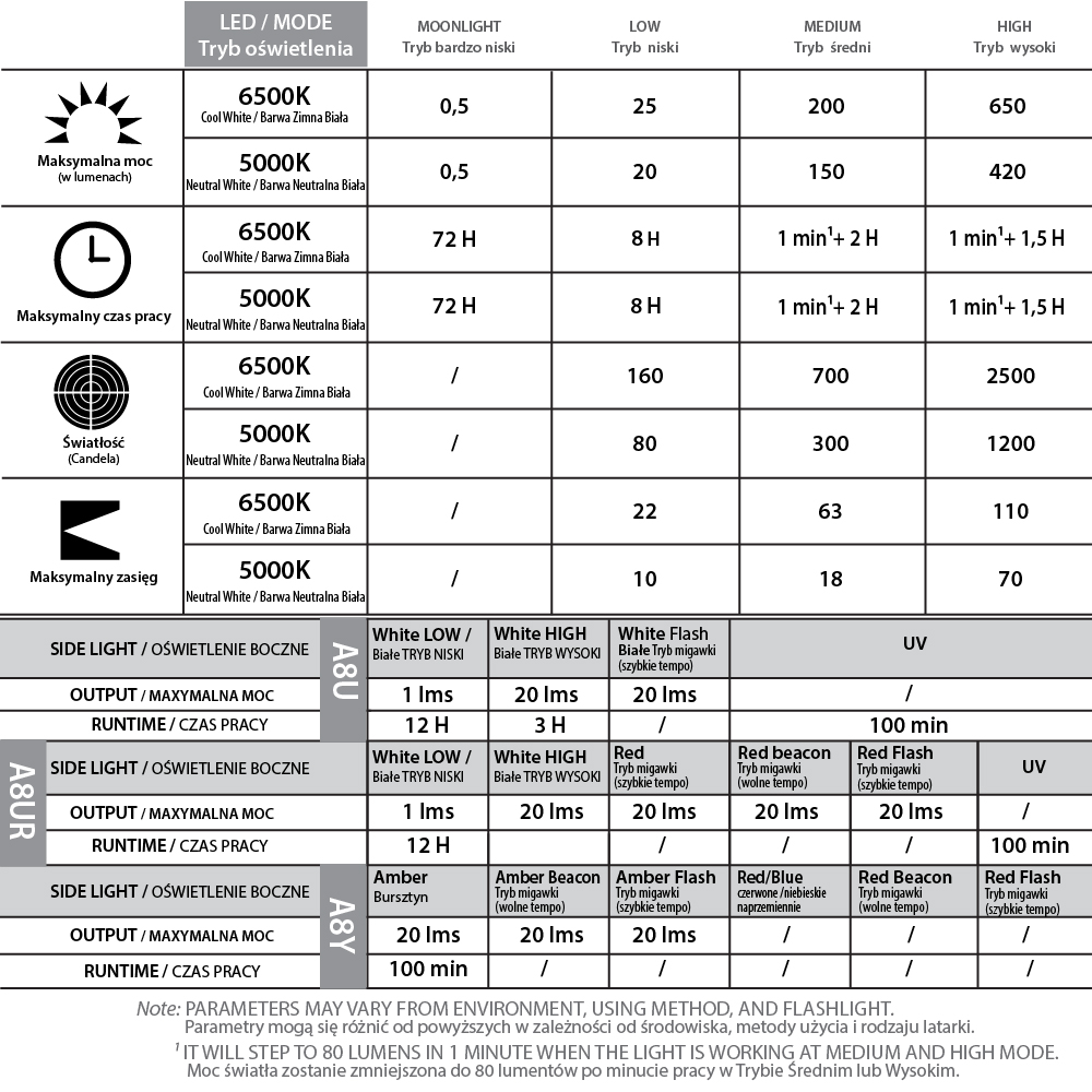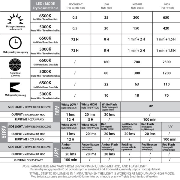 The 4th generation Aurora A8 has a metal switch for better experience, it utilizes a high-performance cool white LED that delivers a max output of 650 lumens and the sidelights Amber/Red/Blue.