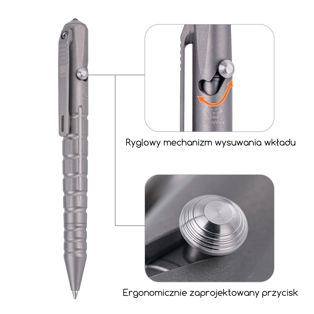 RovyVon Commander C10-G2 Sandblasted Titanium Bolt Action Pen is not just an ordinary writing instrument. The Commander C10 is a high-quality everyday accessory with a stylish and dynamic appearance. It incorporates tactical and military features, and its design is inspired by the look of a grenade (the ribbing). However, don’t be misled. The Commander C10 is primarily a writing tool for people who appreciate unique style and an energetic touch in their gear. It writes beautifully and also features a glass breaker, which can help in escaping from a trapped vehicle or gaining access to its interior to rescue a child or pet left inside. It can also be used for self-defense.