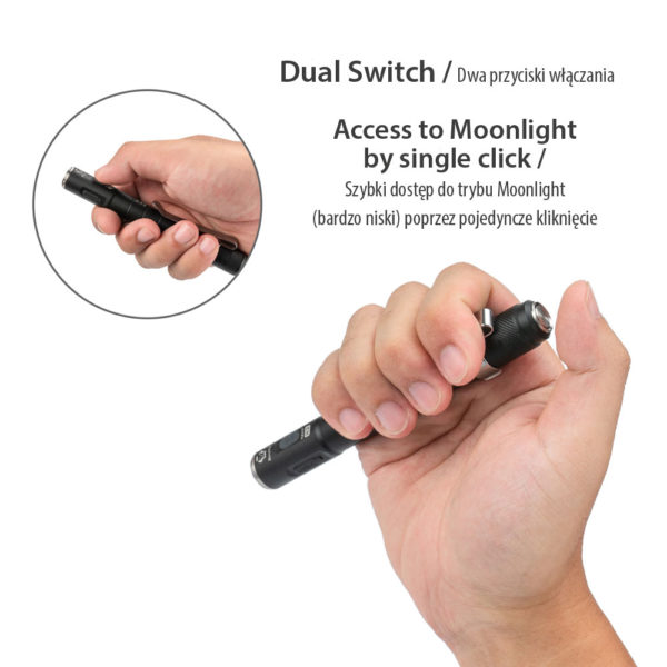 Latarkę obsługuje się jedną ręką, włączanie i wyłączanie następuje po przez wciśnięcie stalowego włącznika tylnego lub włącznika na bocznej stronie obudowy, dla wygody użytkowania zlokalizowanego w okolicach diody. Włączając latarkę wybranym przyciskiem do dyspozycji mamy 7 trybów pracy: tryb bardzo niski, tryb niski, tryb średni, tryb wysoki, tryb błyskowy – STROBO, tryb SOS, tryb sygnalizacyjny – wolna migawka.