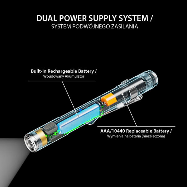 Latarka Hybrid H3 to latarka hybrydowa z dwoma opcjami zasilania. Latarka posiada na stałe wbudowany akumulator litowo-polimerowy o pojemności 300 mAh, ładowalny po przez złącze szybkiego ładowania USB-C. Latarka posiada dodatkową komorę na standardowe baterie AAA (lub akumulatorki 10440), które stanowią dodatkowa opcję zasilania. Po wyczerpaniu się akumulatora, automatycznie włącza się zasilanie z baterii. Którą opcję zasialania w danym momencie stosować można oczywiście również wybrać.