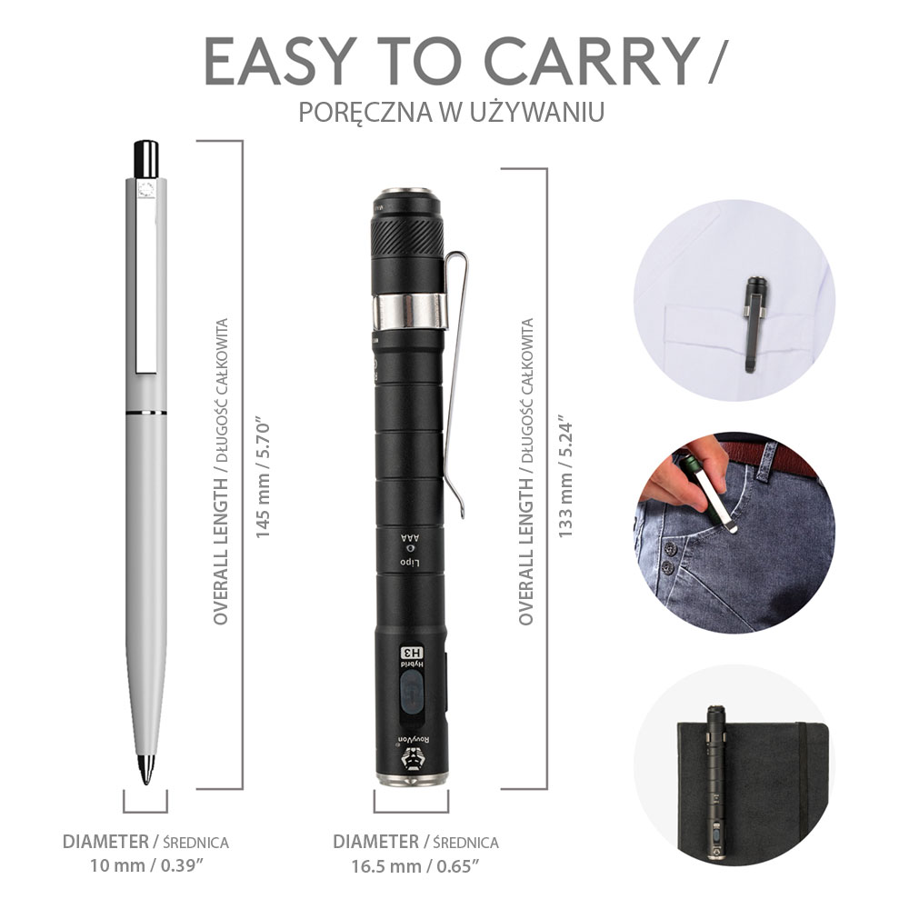 Latarka RovyVon Hybrid H3 AAA Battery EDC Pen Light 500 Lumenów to latarka z linii latarek długopisowych. Jest to użyteczne źródło światła, które można wykorzystać zarówno w trakcie rekreacji, jak też w środowisku pracy.