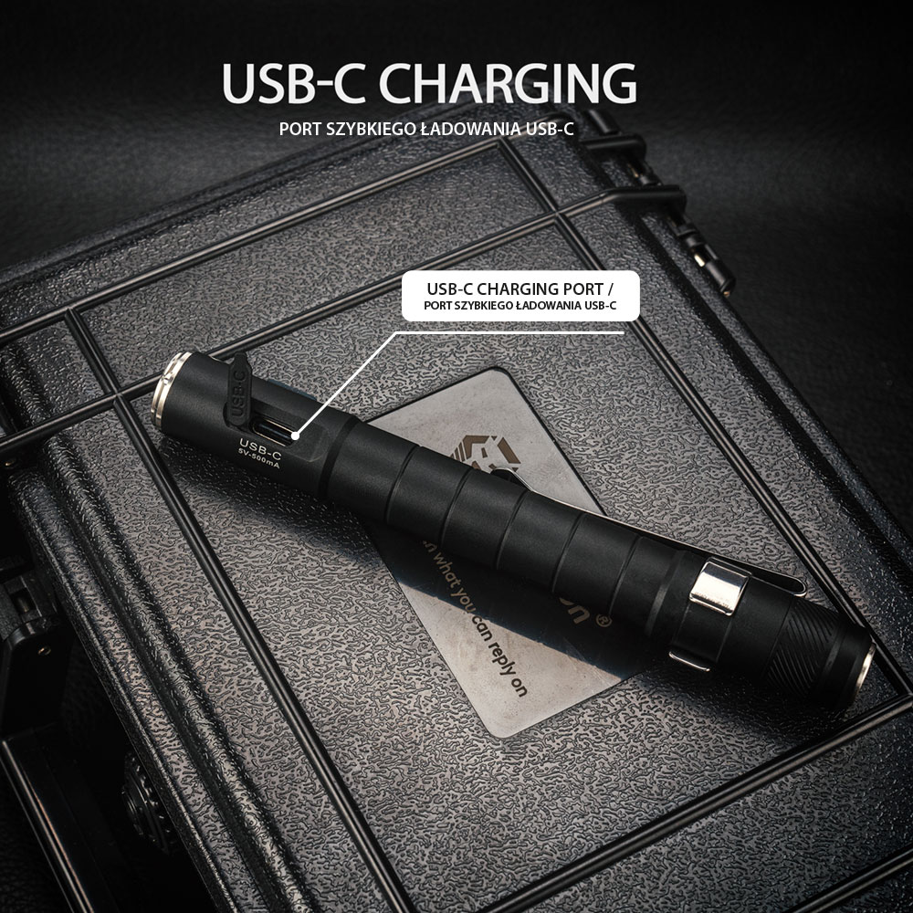 Ładowanie wbudowanego akumulatora następują za sprawą szybkiego portu ładowania USB-C. Latarka posiada wskaźnik procesu ładowania, oznajmiający migającym kolorem niebieskim trwanie procesu ładowania, a ciągłym kolorem niebieskim, pełne naładowanie akumulatora. Kiedy akumulator jest na skraju wyczerpania wskaźnik zasygnalizuje rozładowanie świecąc się na kolor czerwony. Wyłączenie wskaźnika w tym przypadku następuje poprzez przyciśnięcie przycisku.