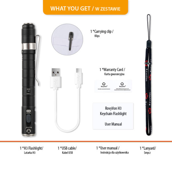Prezentowana latarka RovyVon Hybrid H3 AAA Battery EDC Pen Light 500 Lumenów wykonana z wytrzymałego aluminium lotniczego 6063 posiada wydajną diodę CREE XP-G3 dającą maksymalne oświetlenie o mocy 500 lumenów, a ładowany za pomocą złącza USB-C akumulator zapewnia maksymalnie 54 godziny czasu pracy.