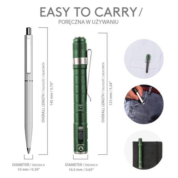 Latarka została zaprojektowana w formie długopisu. Jest bardzo poręczna, zmieści się w dłoni, w kieszeni fartucha lekarskiego, czy odzieży roboczej. Struktura zewnętrzna obudowy, celowo karbowana poprawia chwytność i ładnie się prezentuje.