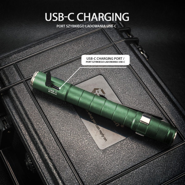 Ładowanie wbudowanego akumulatora następują za sprawą szybkiego portu ładowania USB-C. Latarka posiada wskaźnik procesu ładowania, oznajmiający migającym kolorem niebieskim trwanie procesu ładowania, a ciągłym kolorem niebieskim, pełne naładowanie akumulatora. Kiedy akumulator jest na skraju wyczerpania wskaźnik zasygnalizuje rozładowanie świecąc się na kolor czerwony. Wyłączenie wskaźnika w tym przypadku następuje poprzez przyciśnięcie przycisku.