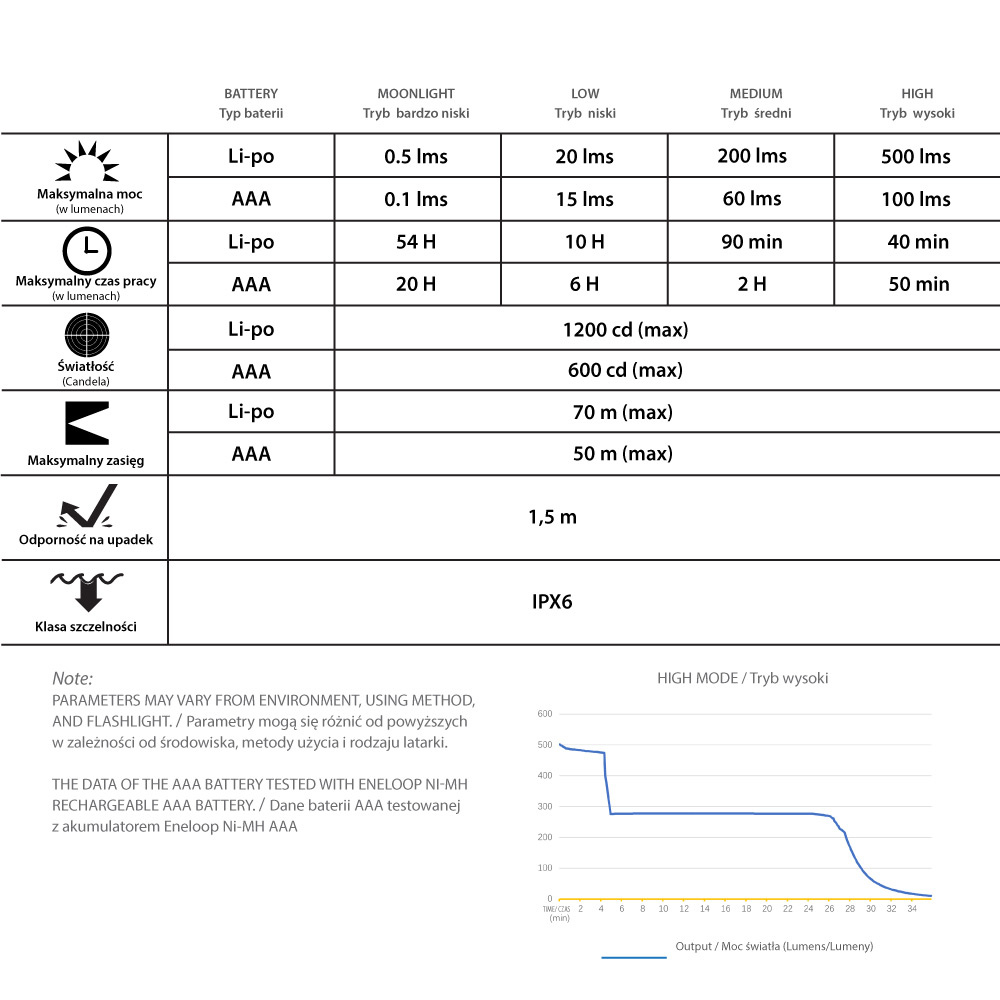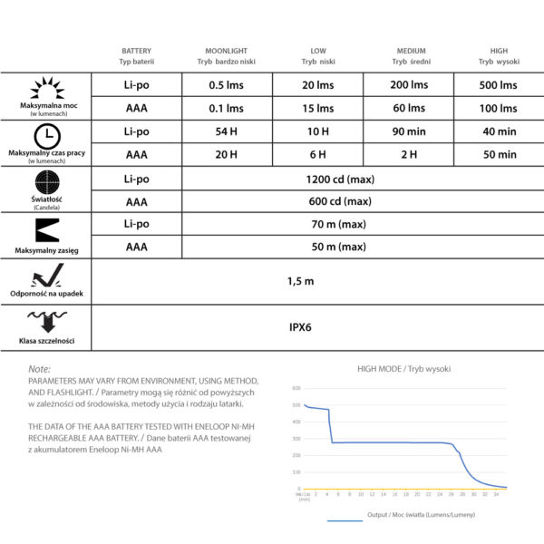 Latarka pozostaje szczelnie zamknięta (akumulator nie jest wymienialny). Przycisk włączający jest zabezpieczony silikonową nakładką, port micro USB silikonową wkładką. Dzięki temu latarka jest odporna na wilgoć i zapylenie w stopniu odpowiadającym normie IPX6 (ochrona przed strumieniem wody pod wysokim ciśnieniem przez co najmniej 3 minuty).