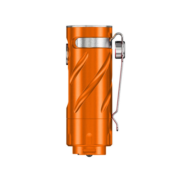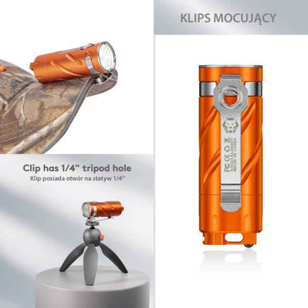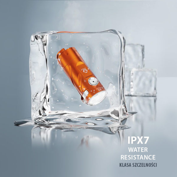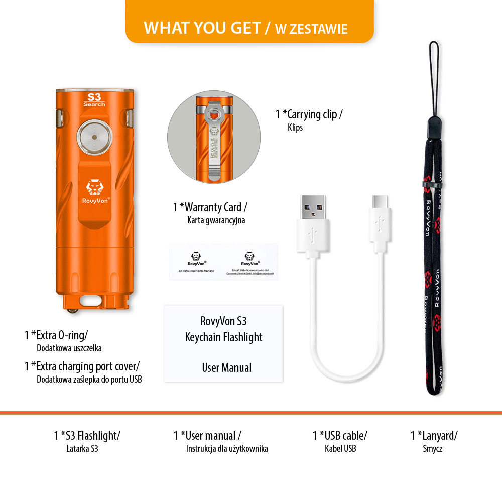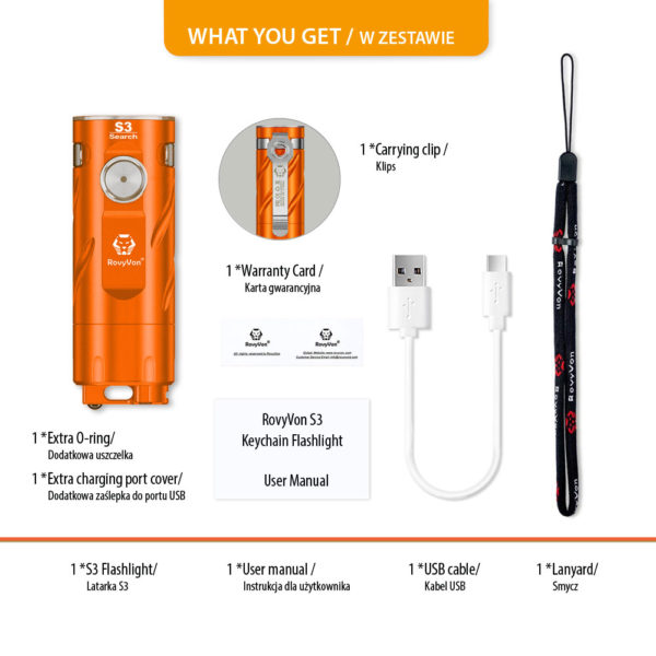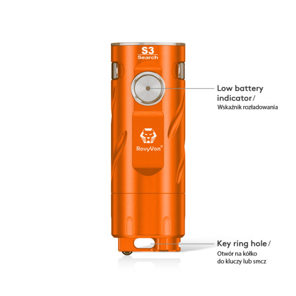 RovyVon S3 Orange Aluminum 3x CREE XP-G3 1800 Lumens is made of durable aluminum, it has 3 efficient CREE XP-G3 LEDs giving maximum illumination of up to 1800 lumens, and the replaceable 16340 lithium-ion battery charged via USB-C connector provides up to 22 hours of working time. On the back of the housing we find a glassbreaker in the form of a ceramic ball. This feature gives the S3 the character of a rescue flashlight.