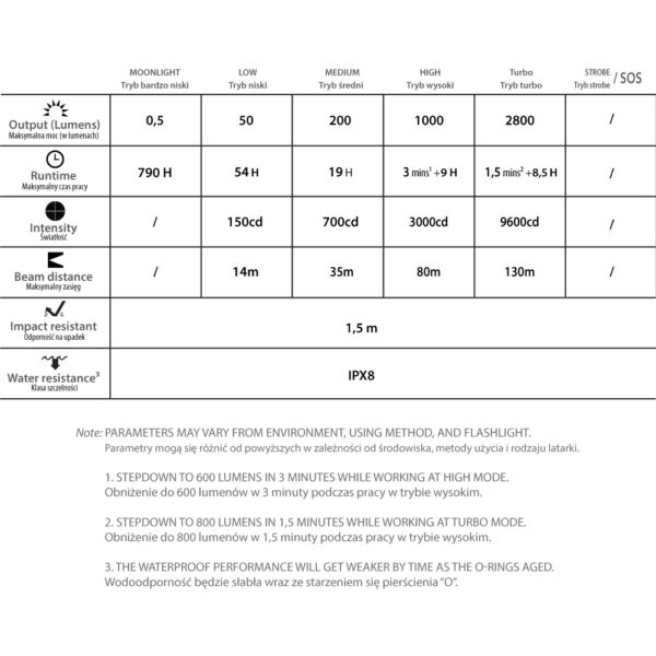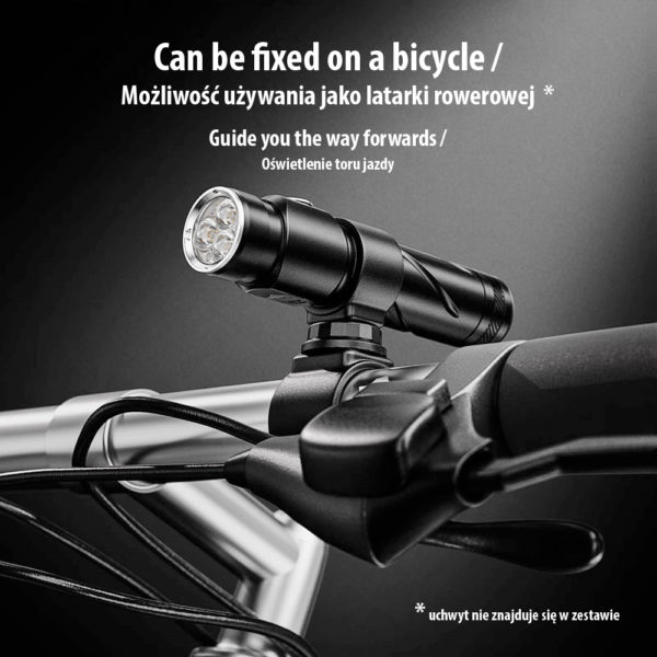 Szczegółowo o blokowani i odblokowywaniu latarki oraz uruchamianiu poszczególnych funkcjonalności można przeczytać w zakładce “Tryby pracy i obsługa”.