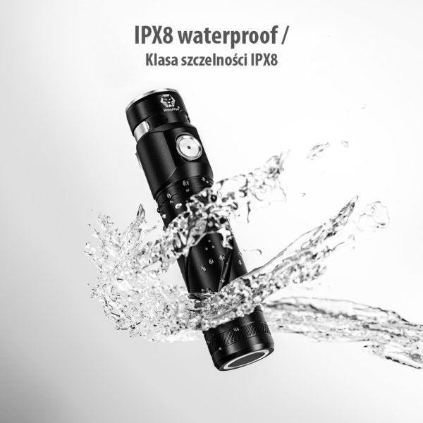 Latarka pozostaje szczelnie zamknięta za sprawą uszczelki pod nakrętką. Port USB-C zabezpieczony jest silikonową zaślepką. Dzięki temu latarka jest odporna na wilgoć i zapylenie w stopniu odpowiadającym normie IPX8 (co oznacza że posiada ochronę przed skutkami zanurzenia w wodzie na głębokość do 2 metrów).