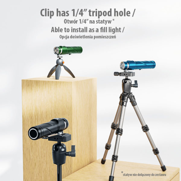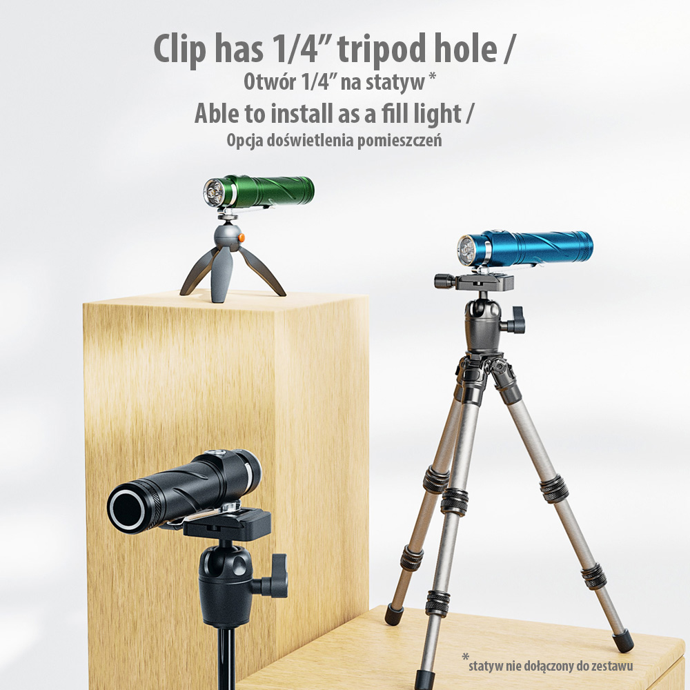 Latarka wyposażona została w stalowy klips mocujący, który daje możliwość zaczepienia jej na wybranym elemencie ubioru, kieszeni, na uprzęży, na plecaku, saszetce biodrowej, na opasce na ramię, czy też w innym miejscu, tak żeby skierować strumień światła w porządnym kierunku lub ułatwić przenoszenie. W klipsie zauważalny jest gwintowany otwór umożliwiający montaż latarki na statywie (na 1/4″).