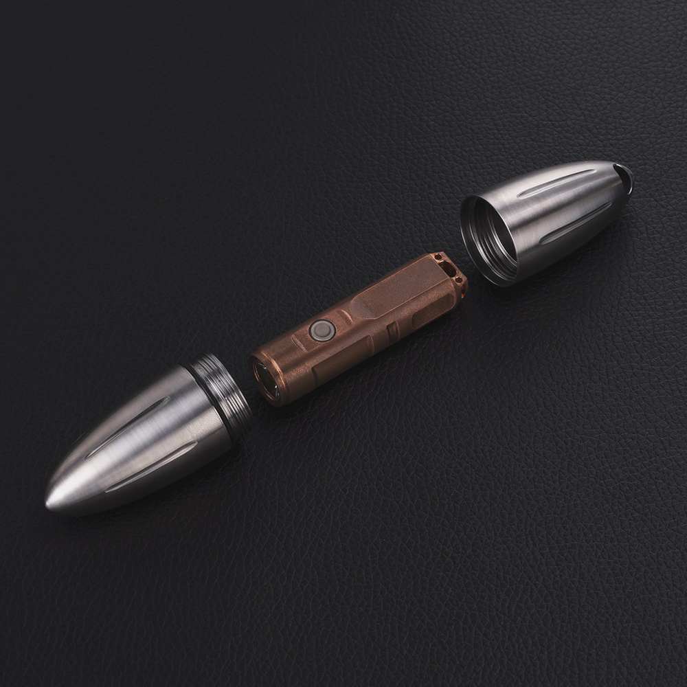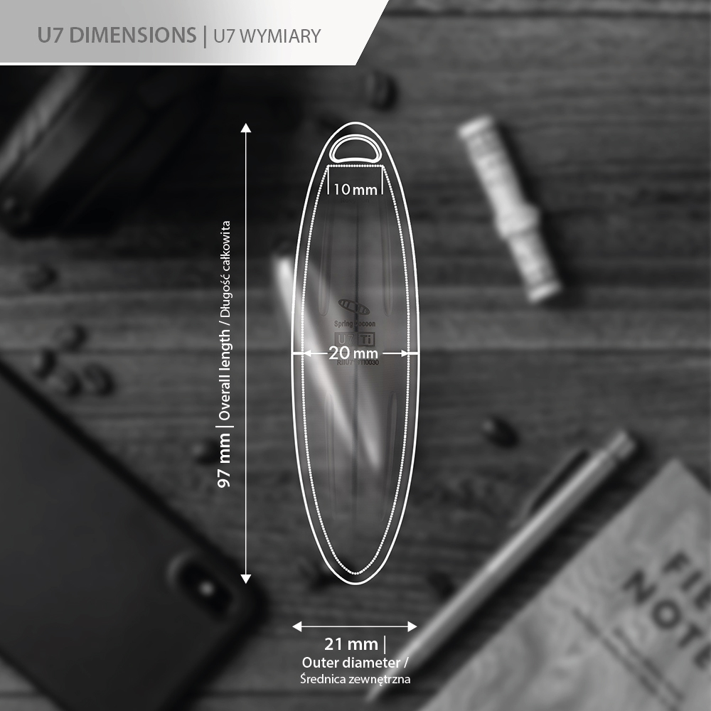 The U7 capsule is crafted from titanium and thanks to the precision CNC machining it’s elegant something like a cocoon so we call it Spring Cocoon. At the top, there’s a lanyard/paracord hole for attaching the U7 to your bag, you can take a spare battery (suitable with AA, CR123, and 16340 batteries) in a dry environment to extend the runtime of your gears, or you can store cash or pills (disinfect the internal before putting the pills into it) for emergencies.