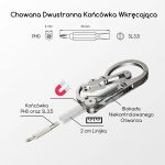 This useful item is equipped with a small folding knife/scalpel, type 11, integrated into the carabiner body. The blade can effectively open packages, cut cardboard, or sharpen a pencil. The carabiner is also equipped with an arm featuring a replaceable double-sided screwdriver tip, PH0 + SL3.5, for everyday repairs. The design of the carabiner body incorporates a 2 cm ruler. In addition to its primary function as an organizer for keys or small everyday items, such as flashlights (you can find flashlight keychains HERE), the carabiner serves as a compact multitool.