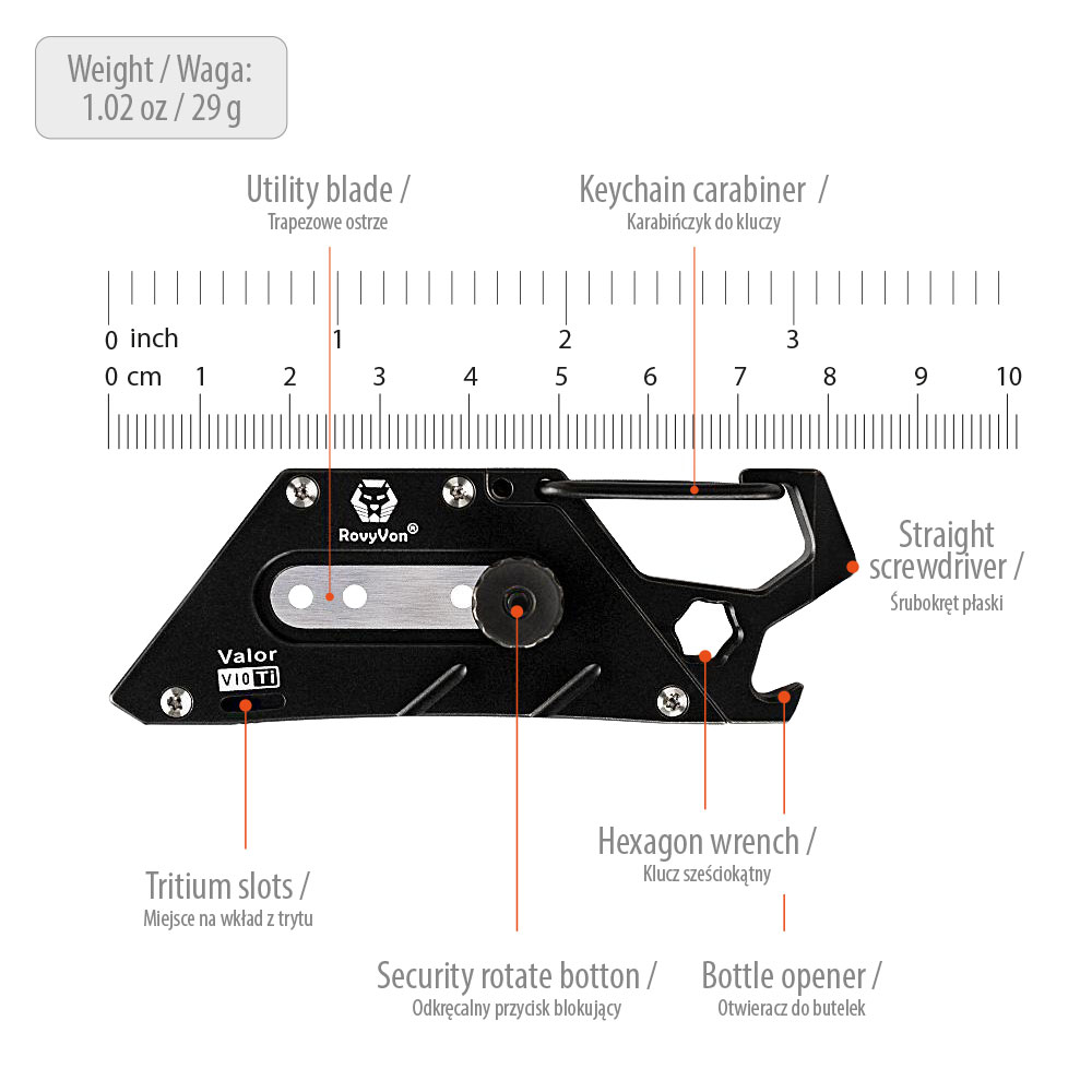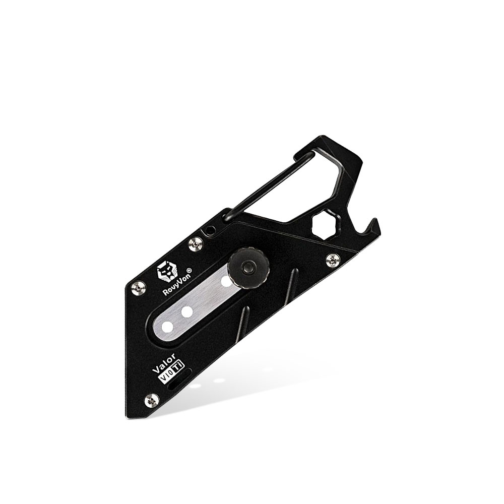 RovyVon Valor V10 Titanium PVD Black Multi-purpose Utility Tool | Knife and Multitool. Multitool made of extremely durable titanium with a carabiner fastening, thanks to which it can be always “at hand”, attached to keys, pouches, backpacks, etc.