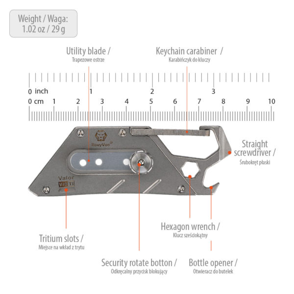 RovyVon Valor V10 Titanium Multi-purpose Utility Tool | Knife and Multitool. Multitool made of extremely durable titanium with a carabiner fastening, thanks to which it can be always “at hand”, attached to keys, pouches, backpacks, etc.