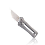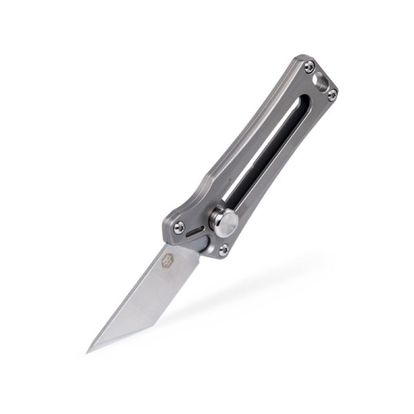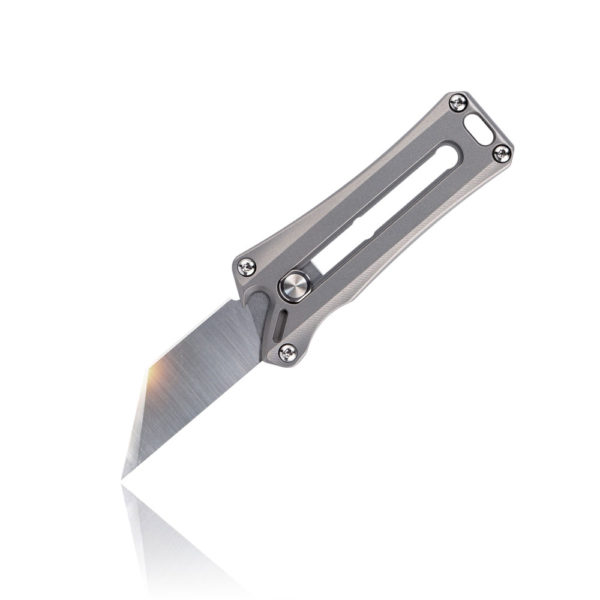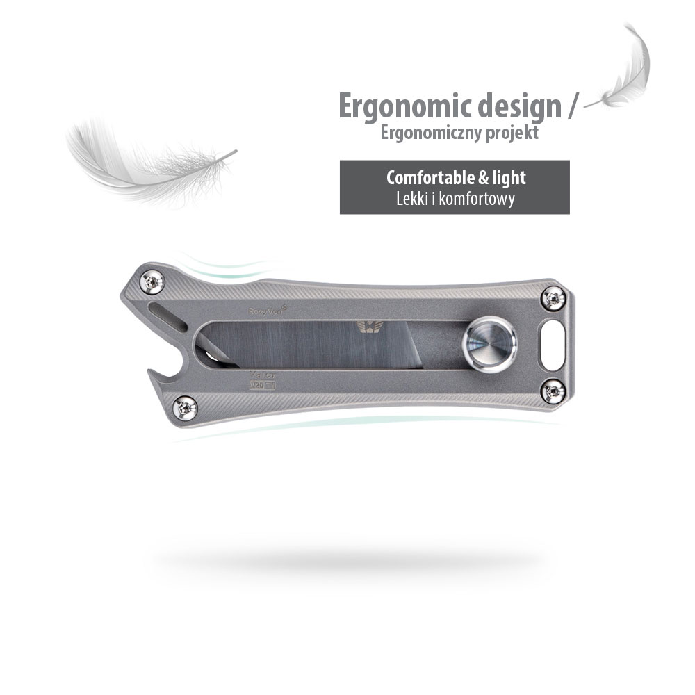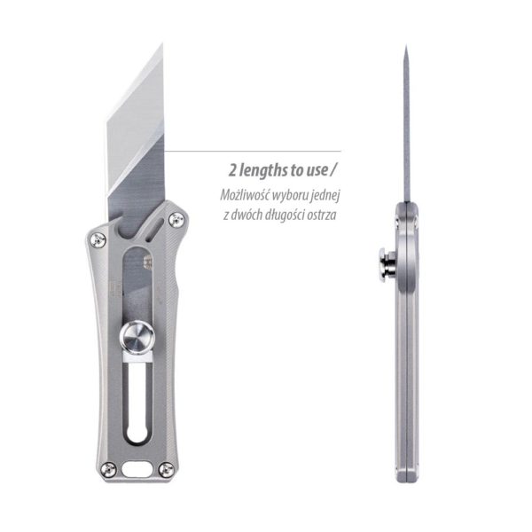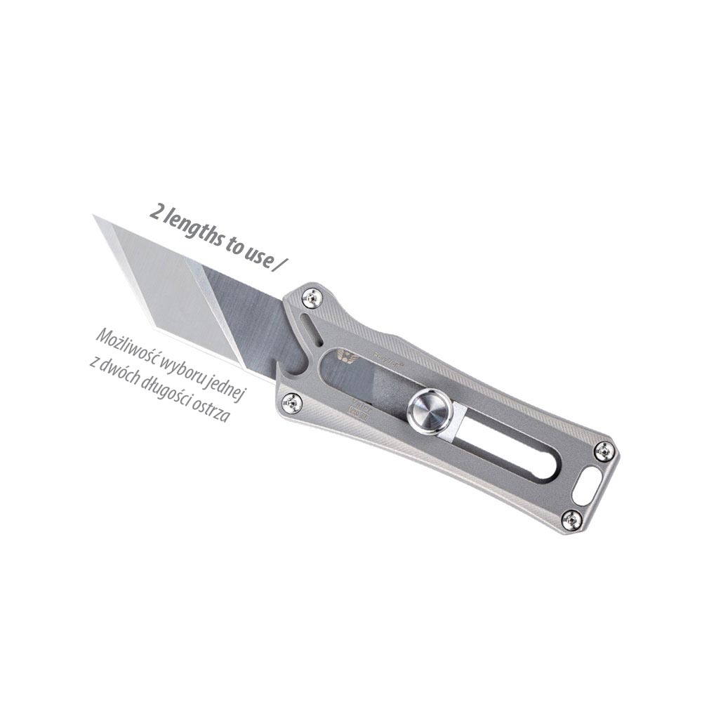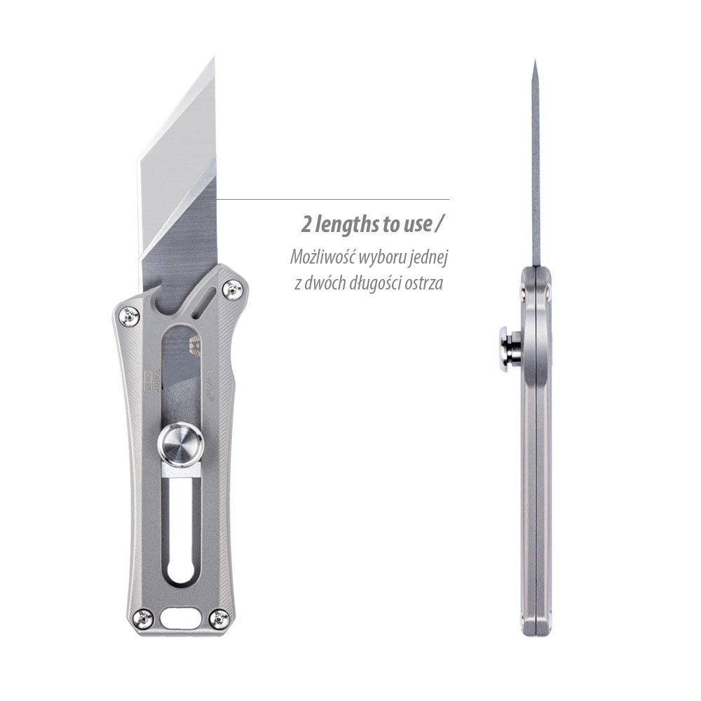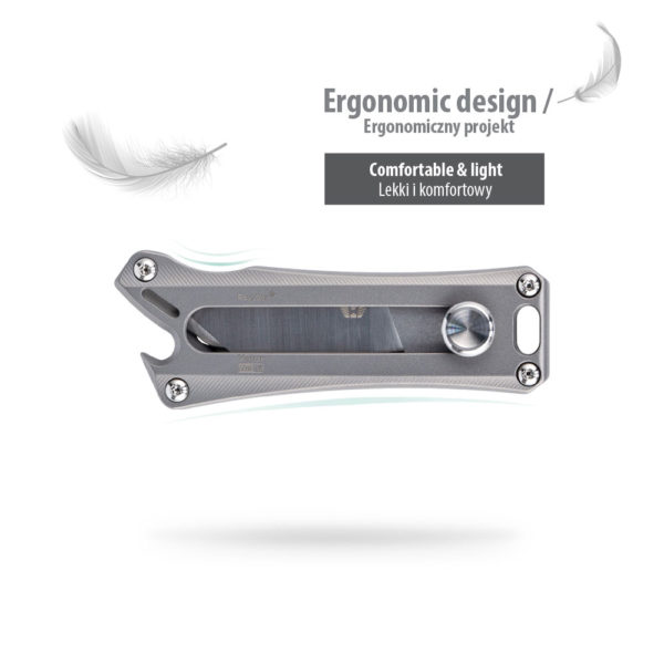The Valor V20 knife has a stainless steel blade with a tanto blade. The blade has the possibility of adjusting the extension length, which is especially useful when working with dies. Of course, the knife itself is very versatile. Opening cartons, parcels etc. is his everyday purpose. The cutting edge can be sharpened when it is dull and the blade itself is also replaceable. The titanium body of the knife has a bottle opener, and the whole thing is designed to be portable and handy thanks to the end of the handle with a hole for a key ring, lanyard or paracord.