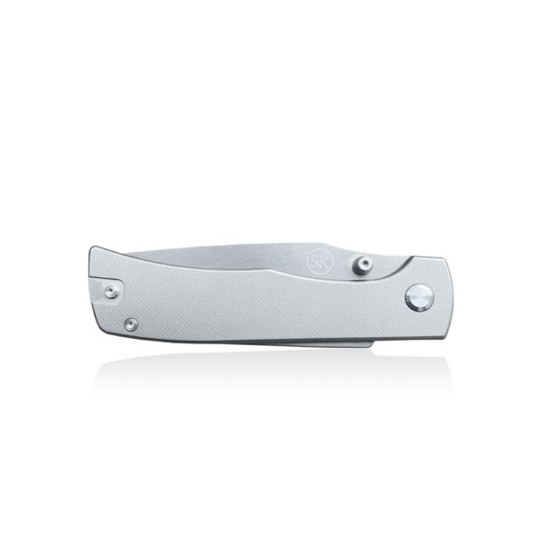 Sandrin Knives Monza Titanium Folding Knife | Tungsten Carbide Blade 71 HRC Recoil Lock in the presented version has natural titanium handle. Easy opening is achieved by double-sided thumb stud. The knife is designed with a deep carry titanium clip decorated with a pattern inspired by Fibonacci sequence.