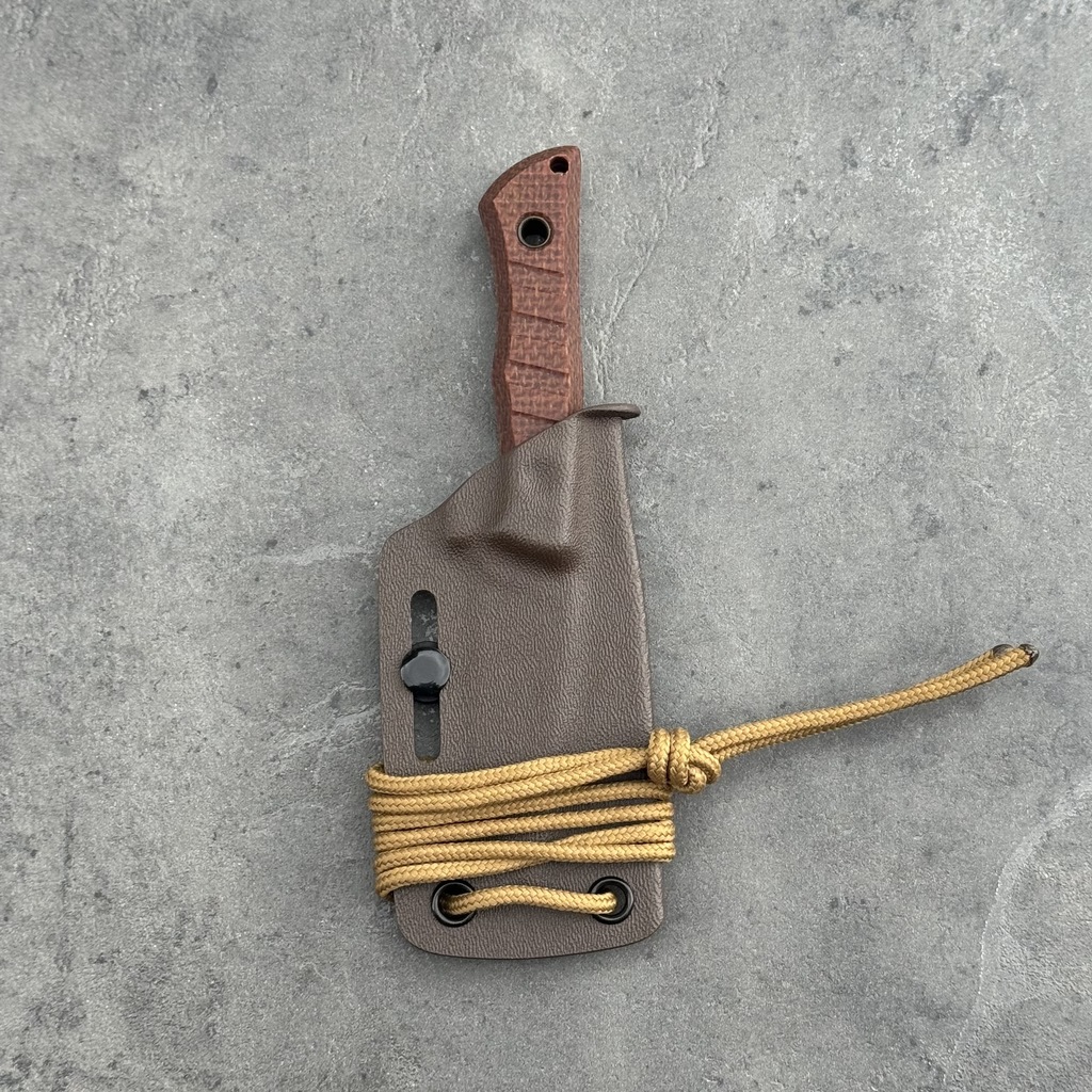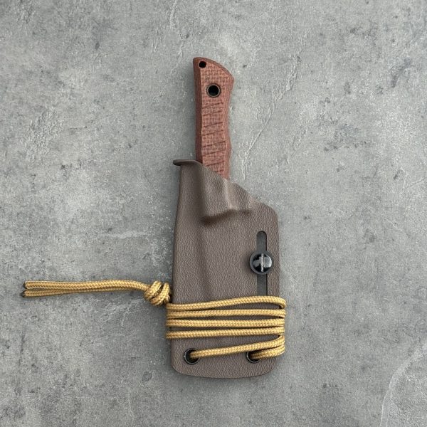 **We carry the whole thing directly in our pocket or on our neck thanks to the attached piece of paracord, accepting the risk of the knife slipping out of the sheath, which occurs with virtually every knife of a similar design (“neck knife”) regardless of the manufacturer.