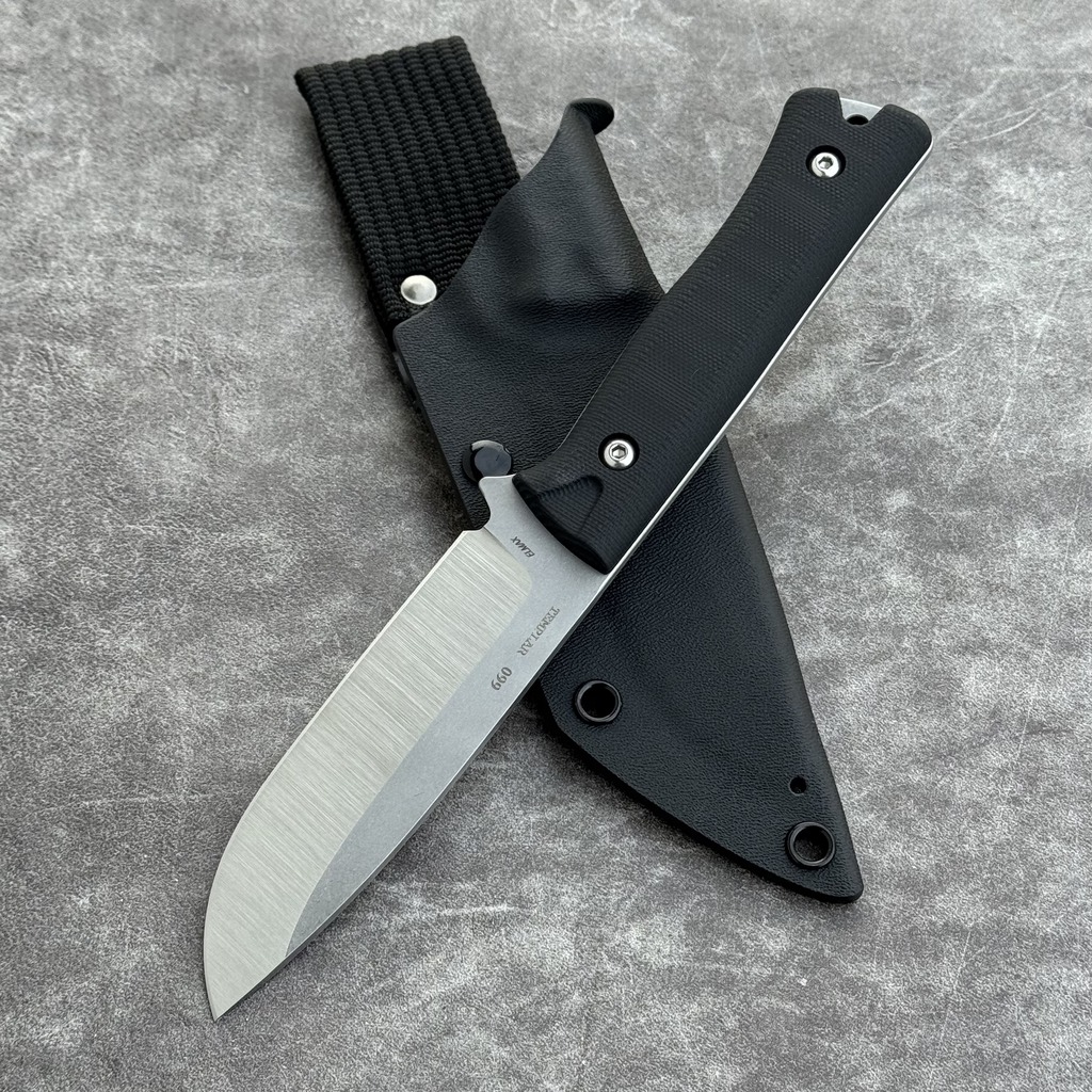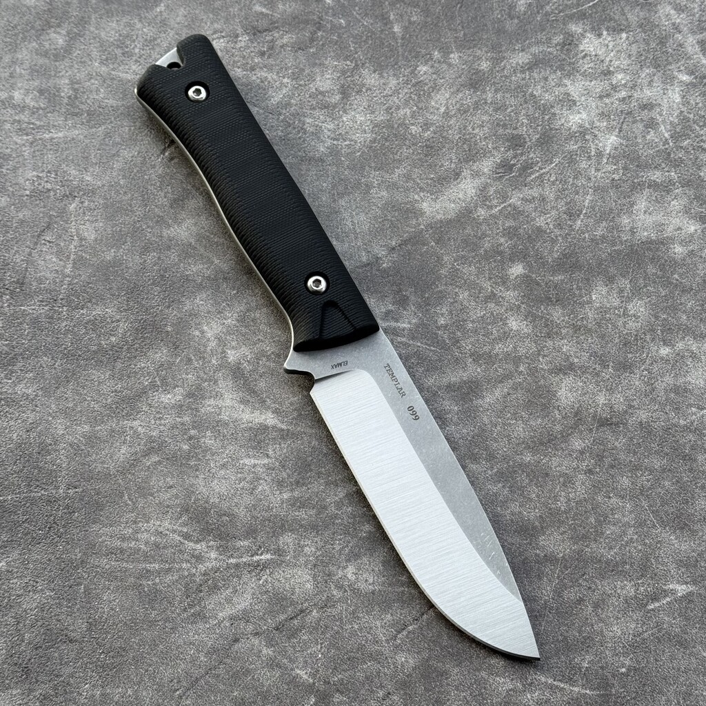 - Blade: Fixed (full tang), drop point, flat grind, plain edge