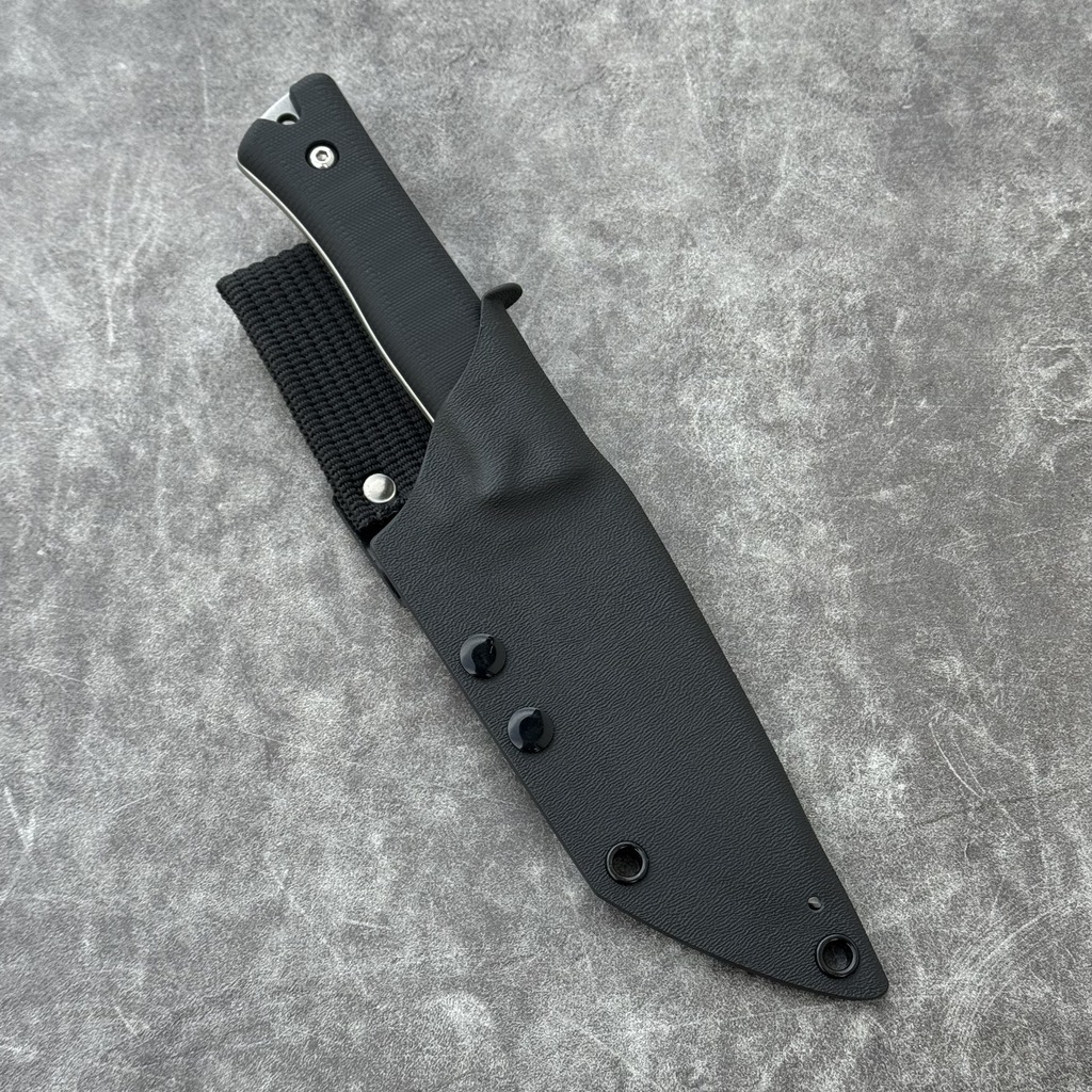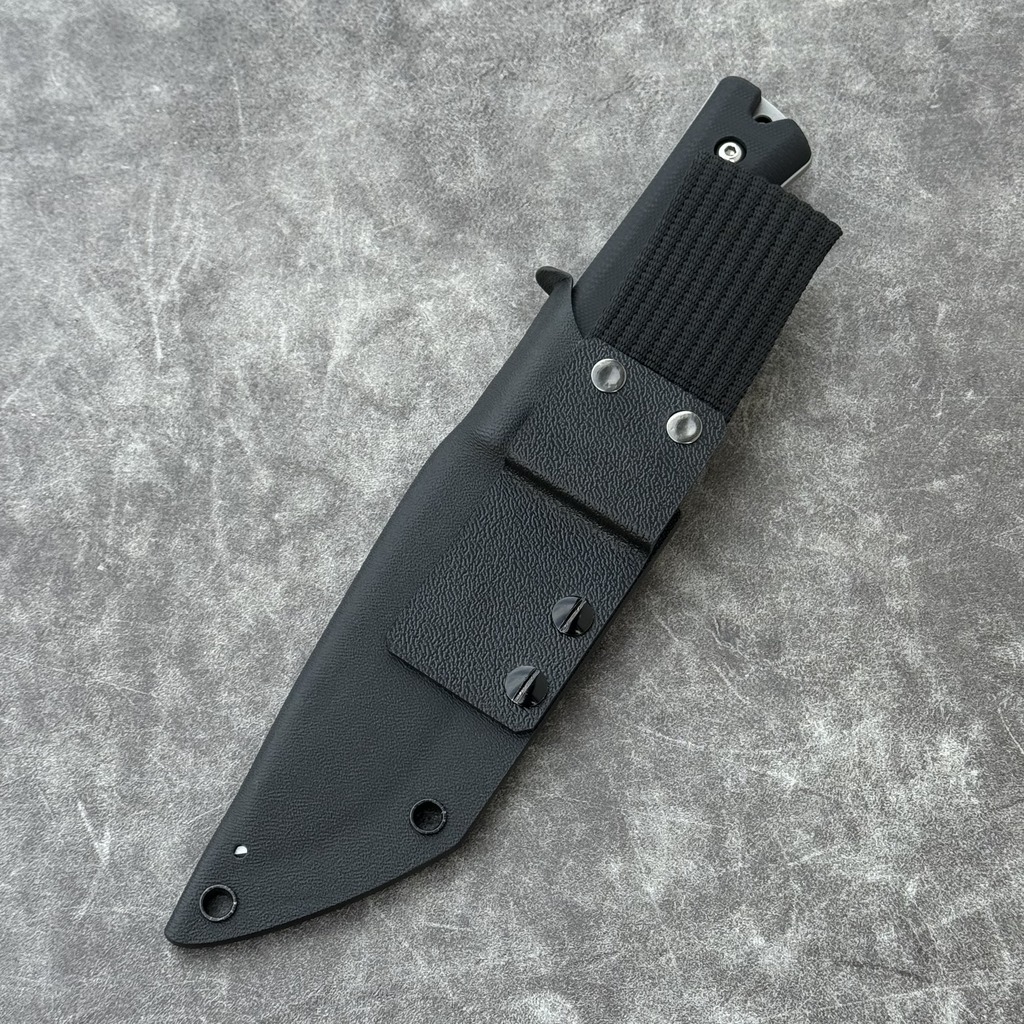 **KYDEX**: The sheath is made from hand-formed Kydex, a tough and weather-resistant material. It offers protection against impacts, scratches, and moisture, and resists many chemicals and environmental conditions.