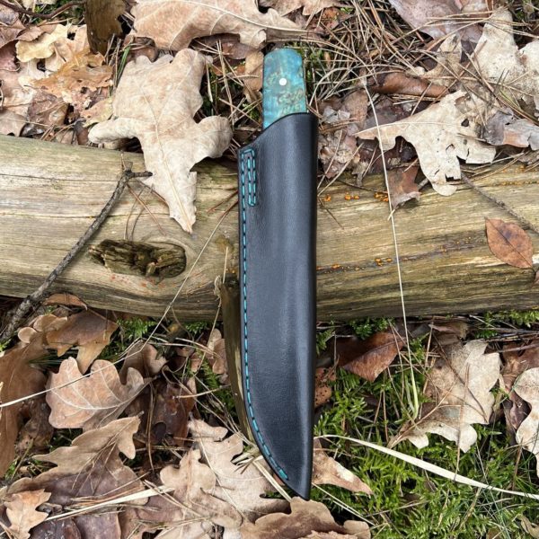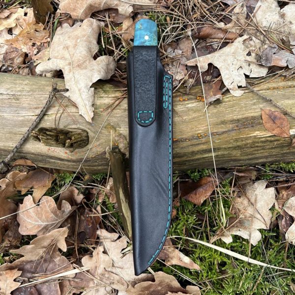 Presented execution is distinguished by a fancy handle, presenting a plethora of colors, with predominant shades of blue. Turquoise, blue, clear wood grains, toxic green (G10 spacers) can all be seen in the handle. The reference in the name to the Greek – blue lagoon “Balos” known for its richness of colors is therefore not accidental. The knife has a premium Elmax steel blade with a satin finish and a black leather sheath with blue stitching.