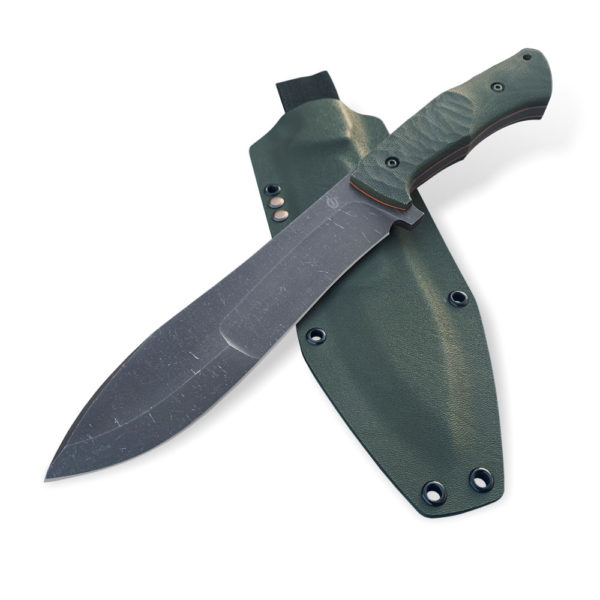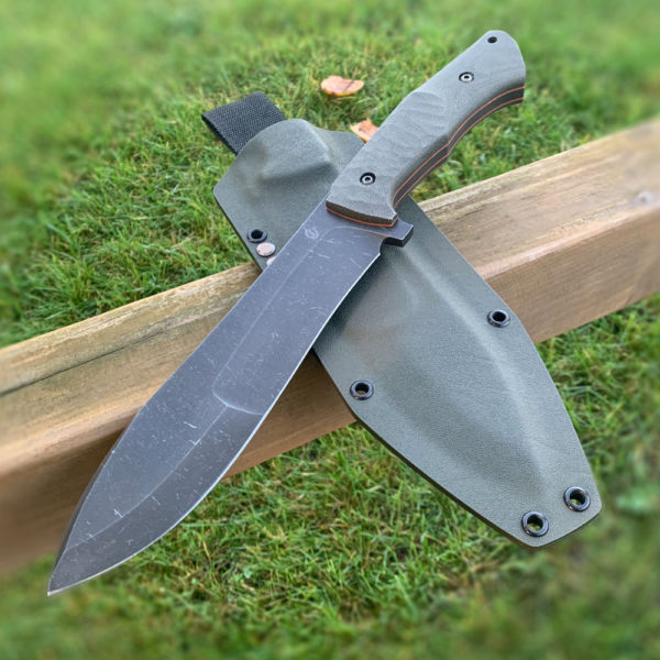 Sliwkosky Knives Nessy Knife | Sleipner | Green Canvas Micarta has a black acid stonewash finish Sleipner steel blade, Green Canvas Micarta handle with orange G10 liners and a olive kydex holster.