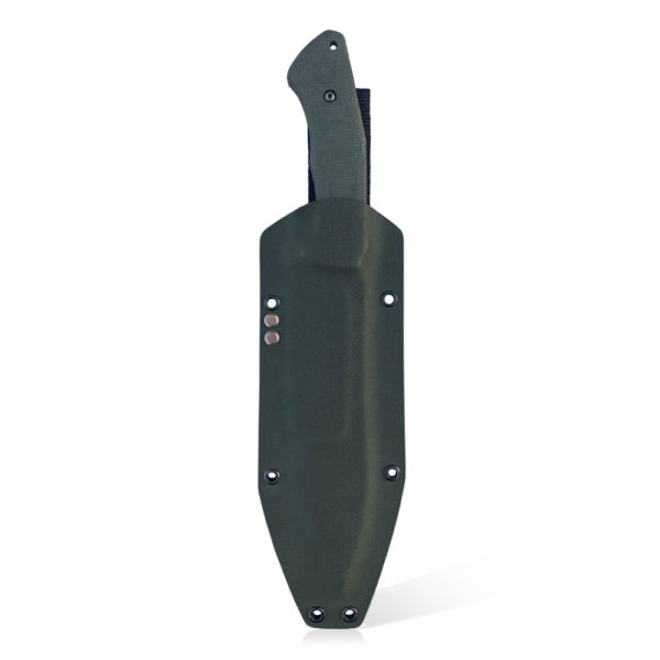 The knife has a holster made of hand-formed kydex material characterized by high impact and scratch resistance, characterized by low moisture absorption, resistant to various weather conditions and many chemicals. In the presented model, the holster is made of green material.