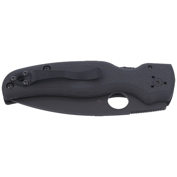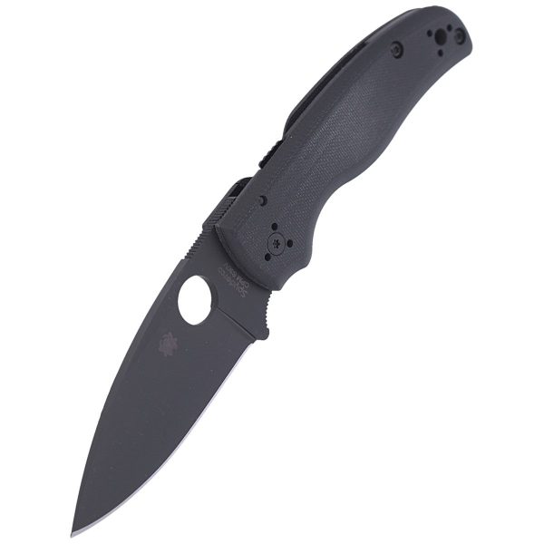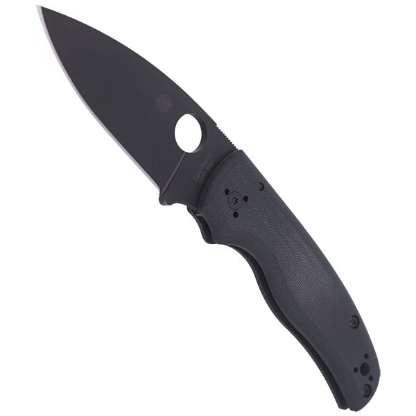 Głownia noża ma profil Drop Point i pokryta jest czarną nierefleksyjną powłoką DLC (Diamond Like Carbon), która jest jedną z najbardziej odpornych na zarysowania i zużycie powłok stosowanych w przemyśle nożowym. Ostrze Plain ze szlifem płaskim pełnym (Full Flat Grind) zapewnia doskonałą geometrię krawędzi tnącej z ostrym czubkiem. Duże okrągłe wycięcie SpyderHole (patent Spyderco) o średnicy 14 mm ułatwia otwieranie foldera, nawet w warunkach zimnych lub mokrych. Długie karbowane oparcie pod kciukiem (upper jimping) na grzbiecie klingi oraz finger choil (podcięcie pod palec wskazujący między rękojeścią a krawędzią tnącą) ułatwiają panowanie nad nożem.
