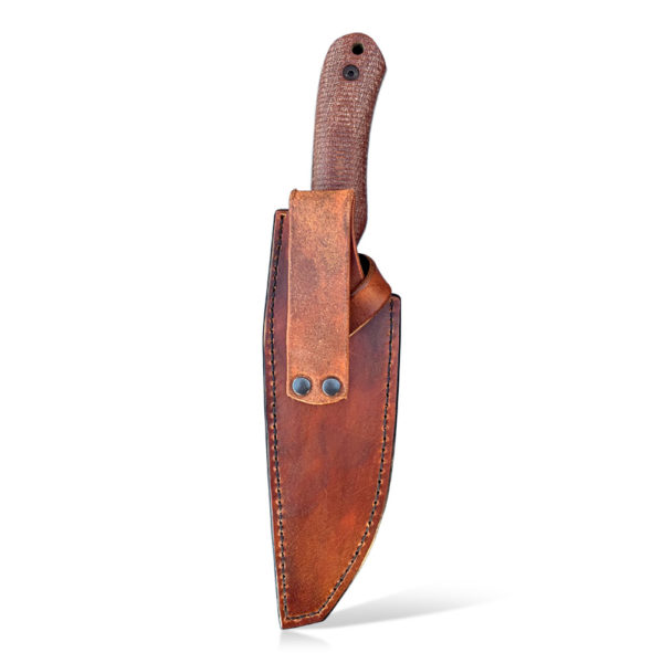 The knife is carried by a completely handcrafted brown leather sheath. The sheath is made of high-quality vegetable-tanned leather. The stitches were made with thick threads with a massive stitch. The edges are nicely finished and smooth. The sheath has a large eyelet for attaching to a belt, and the knife itself is secured against falling out by a belt loop with a massive latch.