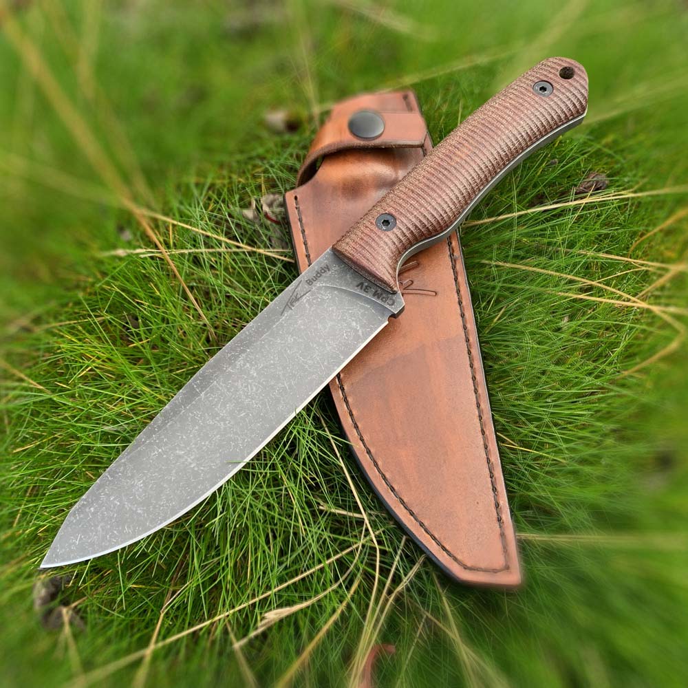 Presented TFK – Tanev Family Knives Buddy Knife | CPM 3V | Natural Micarta is made of the American CPM 3V steel, extremely resistant to overload and chipping. The steel was finished with the acid-stonewash method to obtain a dark color of the blade. The knife has a brown micarta handle (Natural Micarta) and a brown leather sheath made of natural leather is used to carry it.