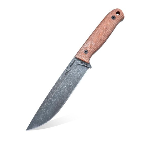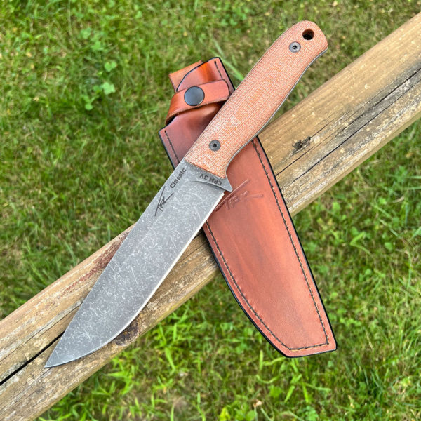 Presented TFK – Tanev Family Knives Classic Knife | CPM 3V | Natural Canvas Micarta was made of CMP 3V steel (US made). The blade has acid-stonewash finish. The knife has a micarta handle scales and a brown leather sheath is used to carry it.