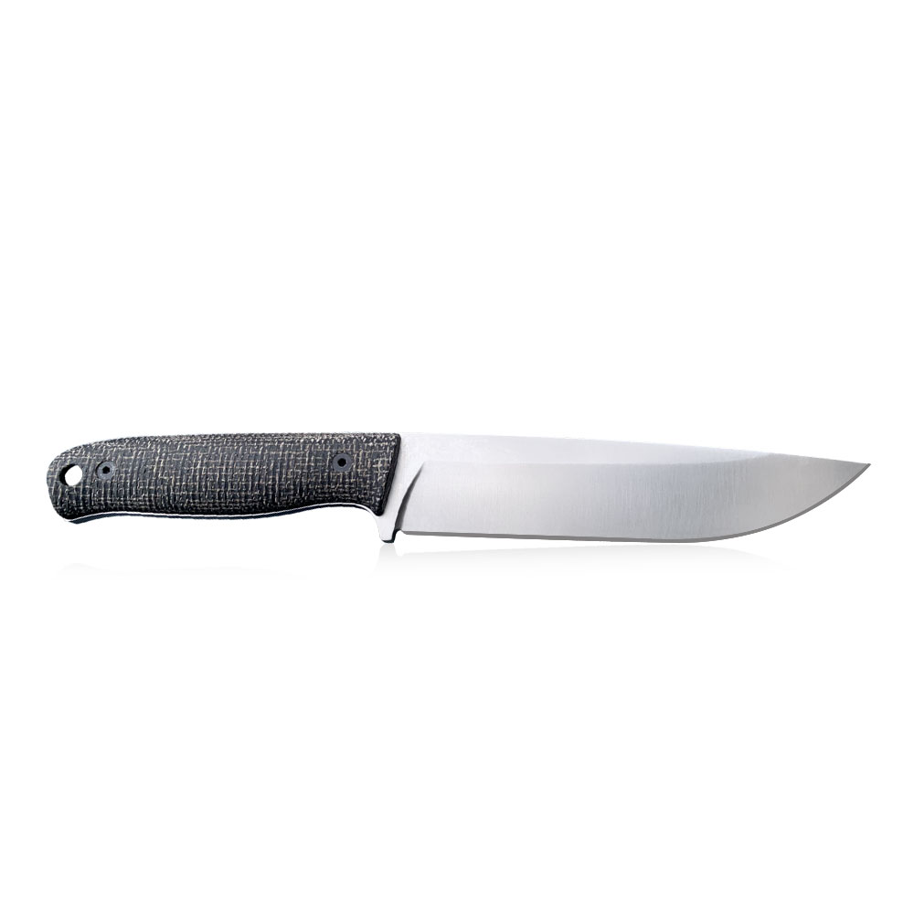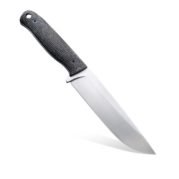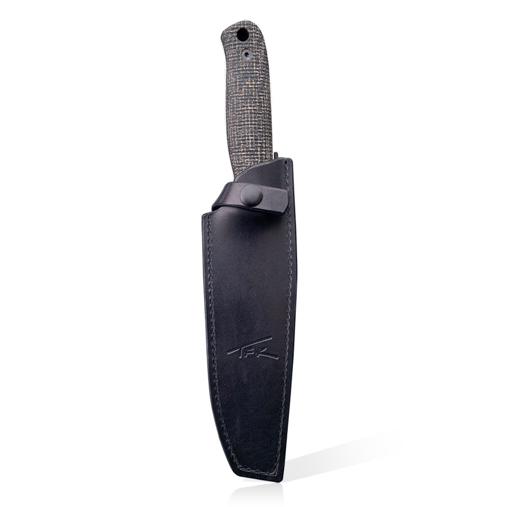 Presented TFK – Tanev Family Knives Classic Knife | Elmax | Black Burlap Micarta was made of European premium steel Elmax. The blade has a satin finish. The knife has a micarta handle and a black leather sheath is used to carry it.