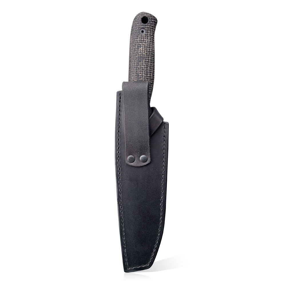 The knife is carried by a completely handcrafted leather sheath. The sheath is made of high-quality vegetable-tanned leather. The stitches were made with thick threads with a massive stitch. The edges are nicely finished and smooth. The sheath has a large eyelet for attaching to a belt, and the knife itself is secured against falling out by a belt loop with a massive latch.