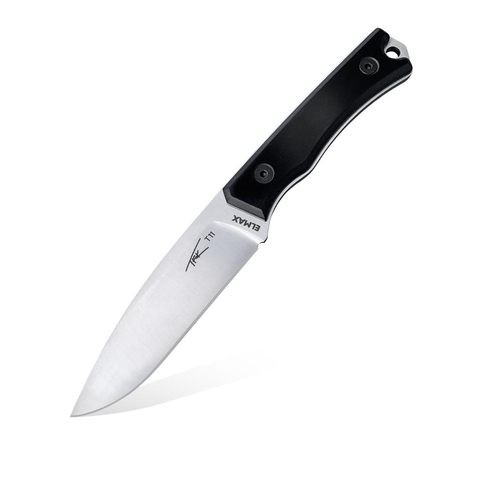 Presented TFK – Tanev Family Knives T11 Black G10 Knife | Elmax it is made of great Elmax steel with a satin finish. The handle covers are made of black G10 composite. The knife comes with a black leather sheath.