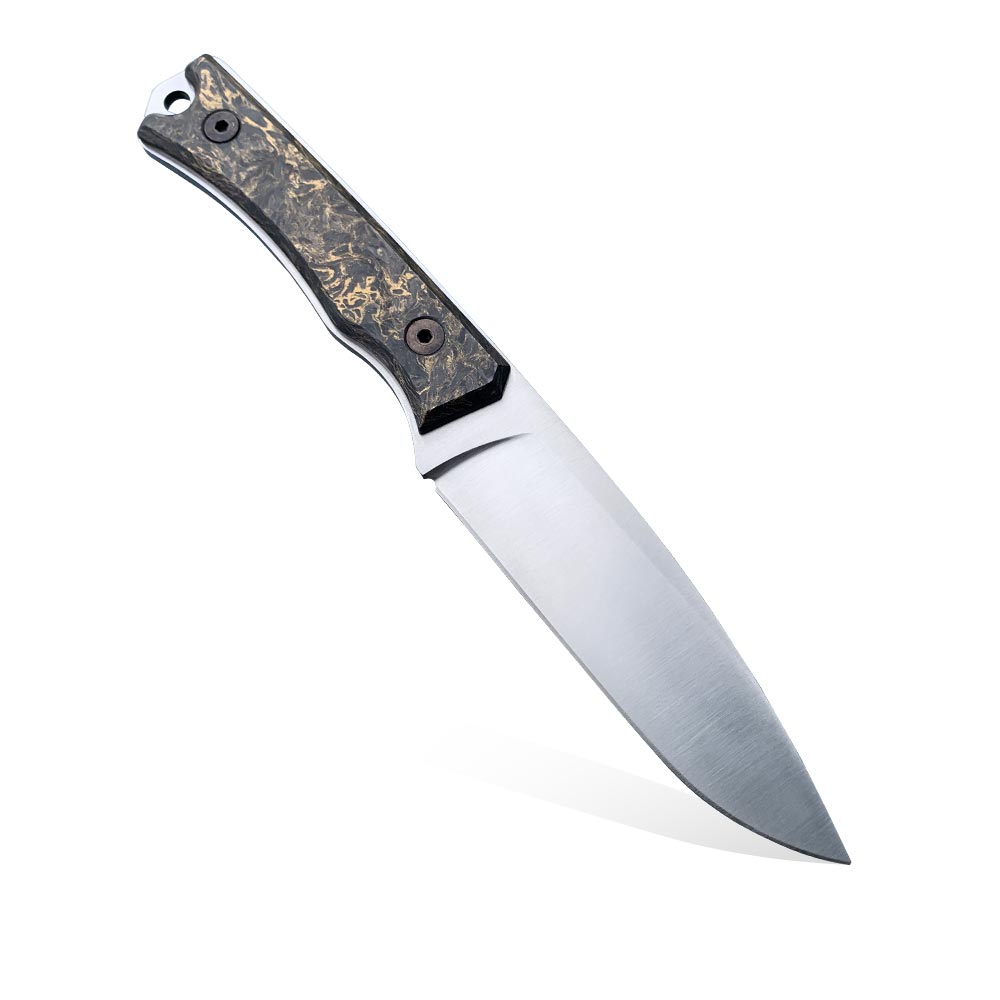 Presented TFK – Tanev Family Knives T11 Dark Matter Gold Knife | Elmax | Fat Carbon it is made of great Elmax steel with a satin finish. The handle covers are made of carbon fiber (fat carbon) in the “Dark Matter Gold” variety with a beautiful array of colors with prominent golden accents. The knife comes with a brown leather sheath.