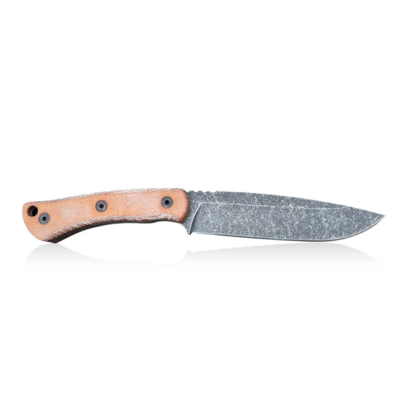 Presented TFK – Tanev Family Knives T7L Knife | CMP 3V | Natural Canvas Micarta is made of CPM 3V steel (Made in USA). The steel has a acid-stonewash finish. The knife has a brown micarta handle scales and a brown leather sheath is used to carry it.