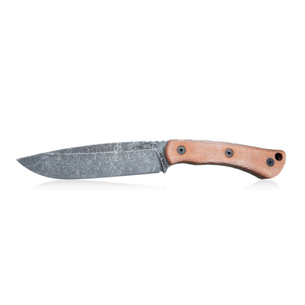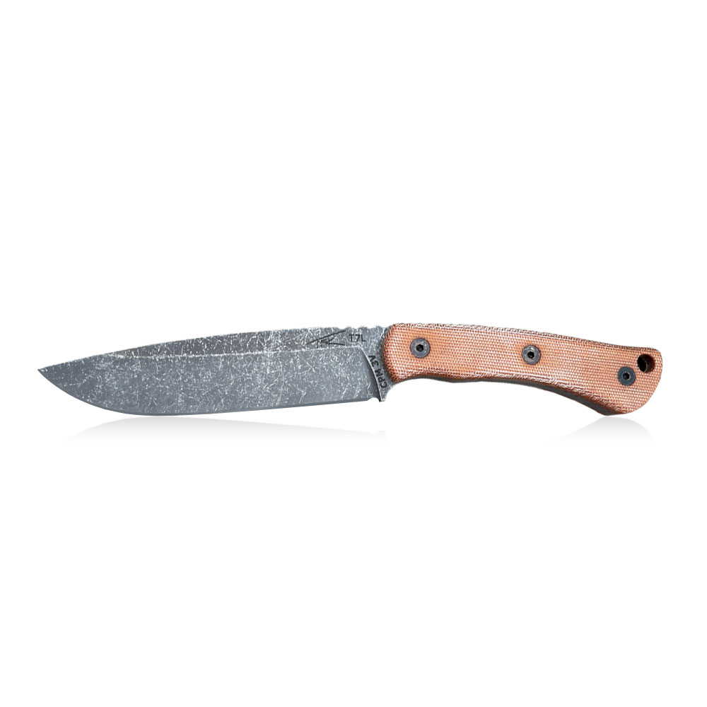 The presented T7L knife is made of CPM 3V powder steel. It is steel produced by the American company Crucible Industries, known for the production of CPM S35VN, CPM S45VN, CPM S90VN and others from this family. CPM 3V is chosen for the production of large-size knives due to its resistance to chipping and very high resistance to overload. This steel wears slowly and remains sharp for a long time. CPM 3V steel is not stainless steel, so to make it easier to care for, the presented knife is finished with the acid-stonewash method, which gives the blade a dark color and perfectly masks any imperfections that may arise during use. The knife is made of one piece of steel, i.e. it has the so-called full-tang construction, probably the most durable construction used in fixed blade knives.