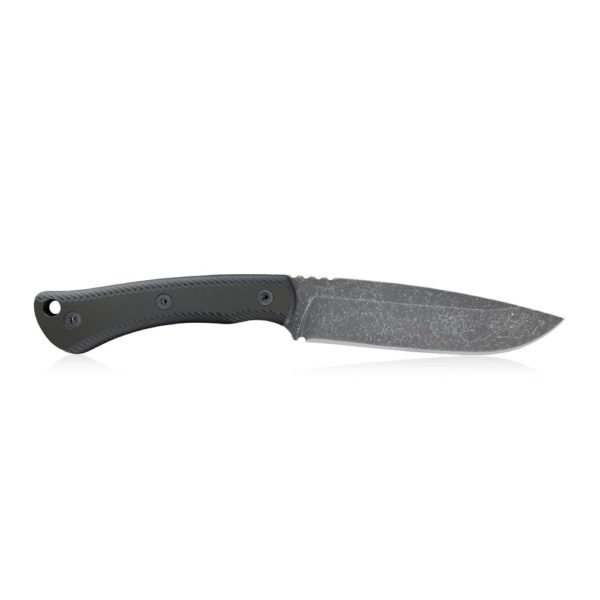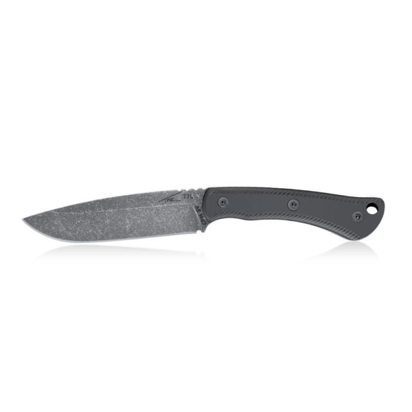 The presented T7L knife is made of CPM 3V powder steel. It is steel produced by the American company Crucible Industries, known for the production of CPM S35VN, CPM S45VN, CPM S90VN and others from this family. CPM 3V is chosen for the production of large-size knives due to its resistance to chipping and very high resistance to overload. This steel wears slowly and remains sharp for a long time. CPM 3V steel is not stainless steel, so to make it easier to care for, the presented knife is finished with the acid-stonewash method, which gives the blade a dark color and perfectly masks any imperfections that may arise during use. The knife is made of one piece of steel, i.e. it has the so-called full-tang construction, probably the most durable construction used in fixed blade knives.