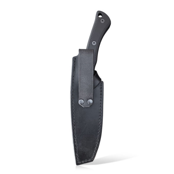 The knife is carried by a completely handcrafted black leather sheath. The sheath is made of high-quality vegetable-tanned leather. The stitches were made with thick threads with a massive stitch. The edges are nicely finished and smooth. The sheath has a large eyelet for attaching to a belt, and the knife itself is secured against falling out by a belt loop with a massive latch.