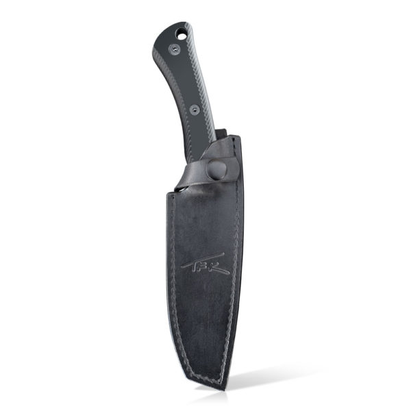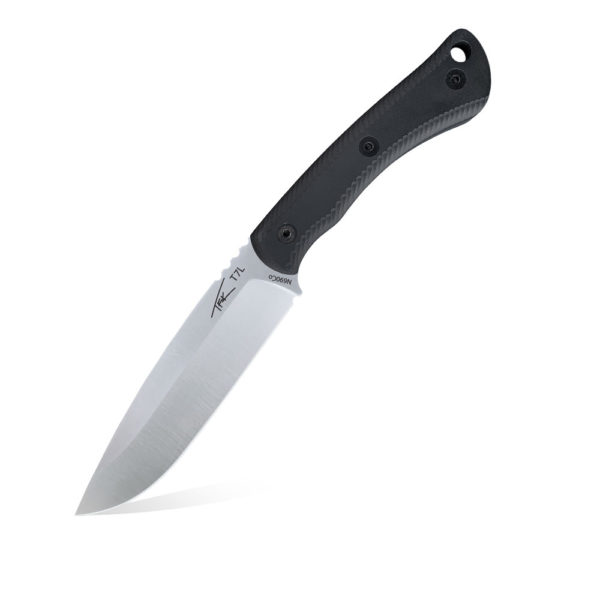 Presented TFK – Tanev Family Knives T7L Knife | N690Co| Black G10 is made of N690Co cobalt stainless steel. The steel has a satin finish. The knife has a black G10 composite handle and a black leather sheath is used to carry it.