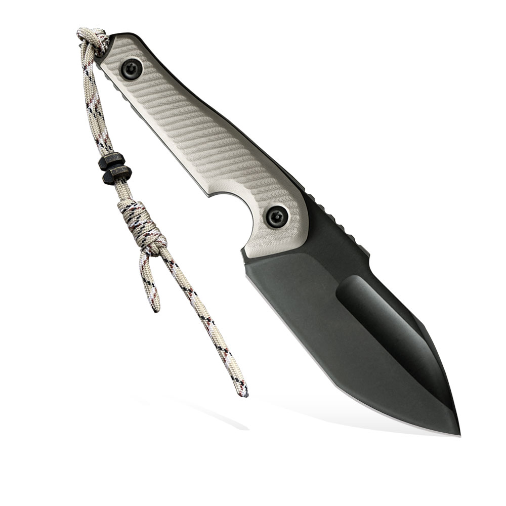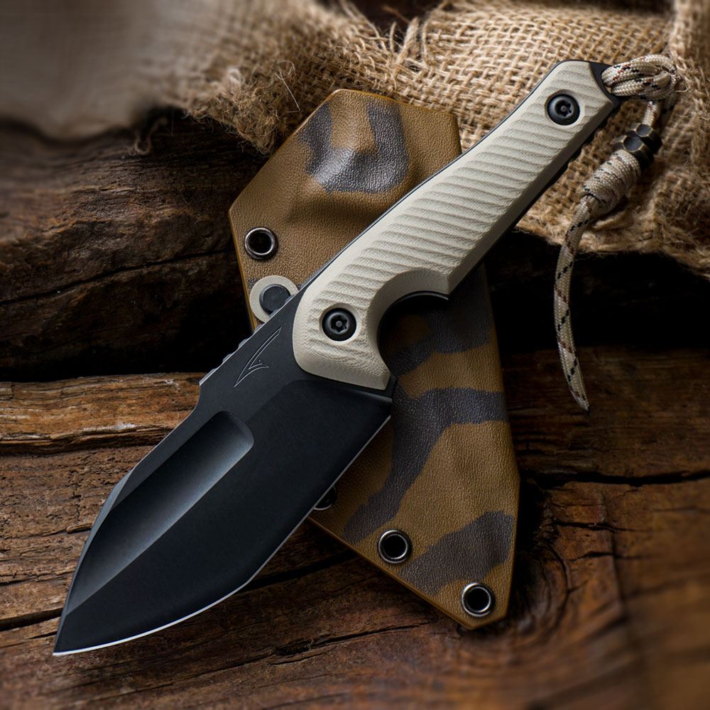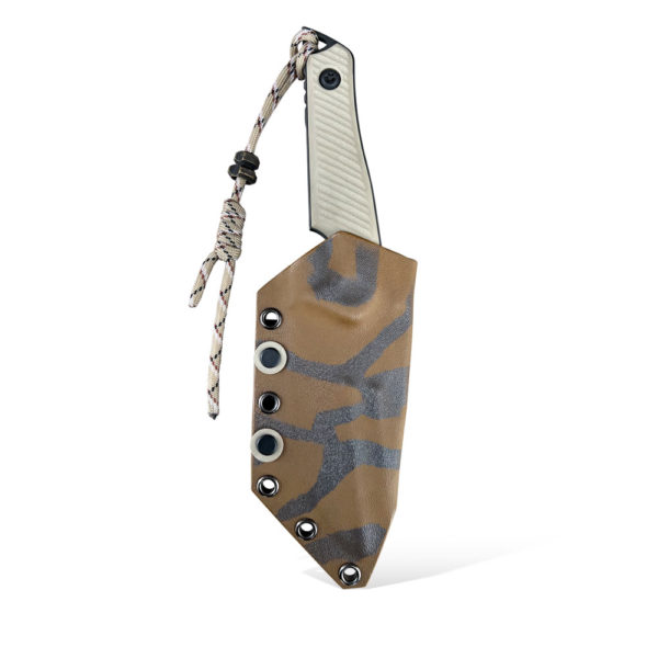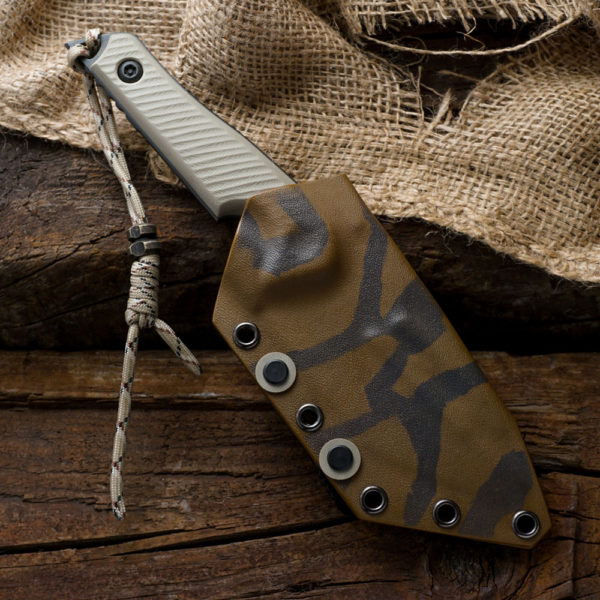 Torbé Knives Lontra Brown Zebra has an efficient blade made of Sleipner steel, known for its overload resistance, covered with a black DLC coating (with a hardness close to 90 HRC). The grips are made of a Desert Tan G10 with transverse style texturing. The set includes Kydex sheath (‘brown zebra” color). The knife comes with a unique vintage brass bead (custom bead).