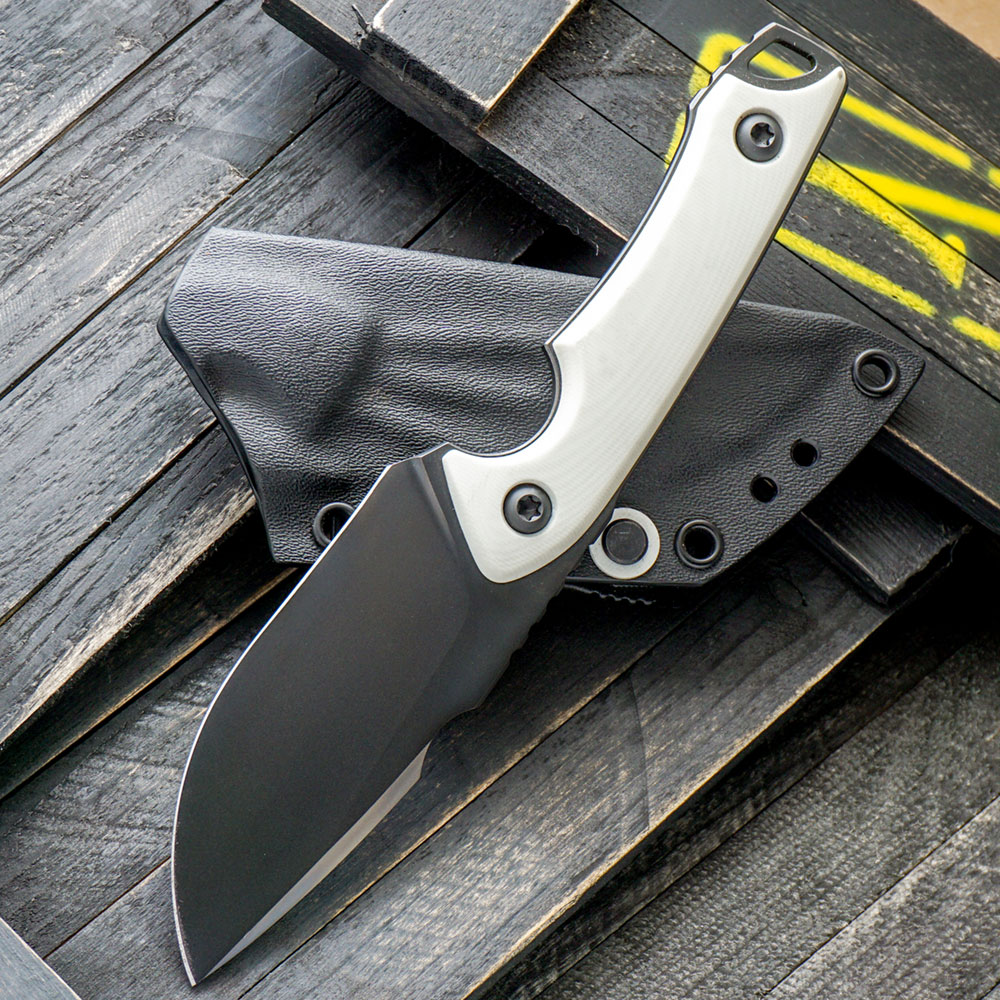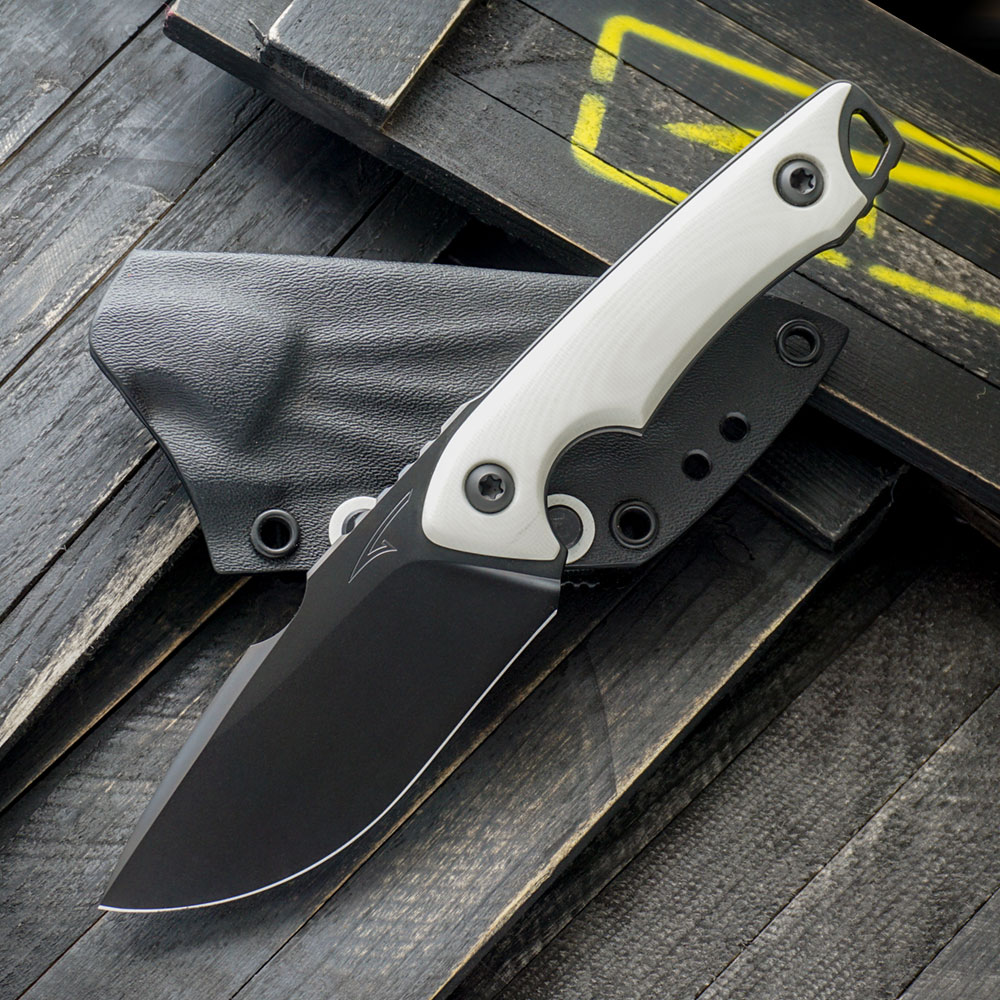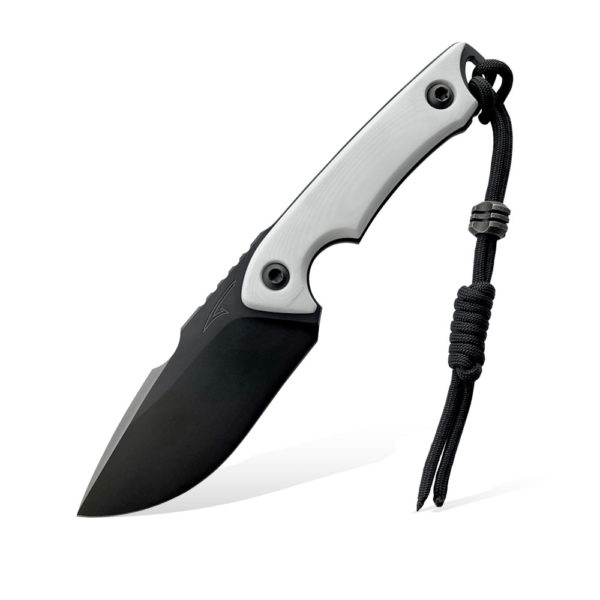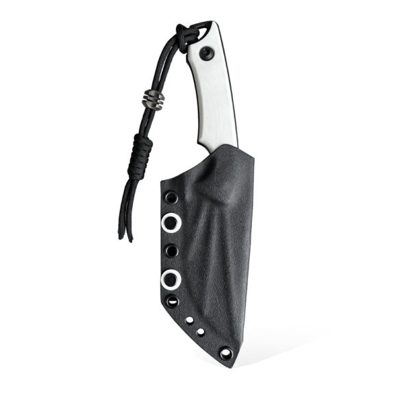Torbé Knives Lontra Tiny Tot Pearl Tone has an efficient blade made of Sleipner steel, known for its overload resistance, covered with a black DLC coating (with a hardness close to 90 HRC). The grips are made of a smooth white G10 composite. The set includes a black Kydex sheath. The knife comes with a unique vintage brass bead (custom bead).
