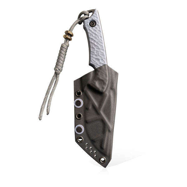 Knife comes with sheath made of hand-formed Kydex material. Kydex is characterized by high impact and scratch resistance, low moisture absorption, resistance to various weather conditions and many chemicals. Sheaths made of it are used comfortably and for a long time. To facilitate the removal of the knife, a thumb rest has been designed, thanks to which the knife can be removed in a controlled and safe manner. The sheath has pass-through pins to which you can attach, for example, a tinder holder (not included) or use them to attach it to a backpack. We attach the sheath to the belt with the T-Clip buckle designed by Bob Terzuola, made by CIVIVI, with which Torbé Knives cooperates as a designer. The T-Clip is the equivalent of the Tek-Lok buckle and is compatible with MOLLE solutions. The use of the T-Clip buckle coincides with the knifemeker’s concept of carrying the knife in full readiness on a belt directly at hand.