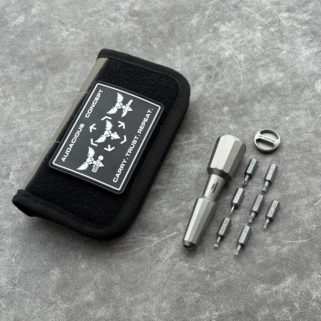 The set includes a lightweight nylon pouch with a hook-and-loop closure, featuring a velcro panel with an included Audacious Concept PVC patch. Inside are two pockets — one designed for the Bit Master, and the other left for any additional EDC item (e.g., flashlight, multitool, folding knife, spare bits).
