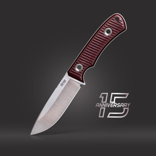 A unique anniversary edition of the bestselling Polheim from TRC Knives. A satin-finished blade made from exceptional RWL-34 steel, engraved with a special 15th-anniversary mark. Handle scales crafted from exclusive polished Micarta in a rusty chestnut shade (Maroon Micarta), paired with a light brown leather sheath featuring the embossed TRC logo. The classic drop point blade design includes a characteristic swedge on the spine.
