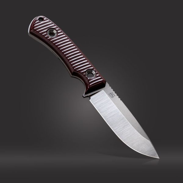 - Blade: Fixed (full tang), drop point profile with flat grind and swedge, plain edge