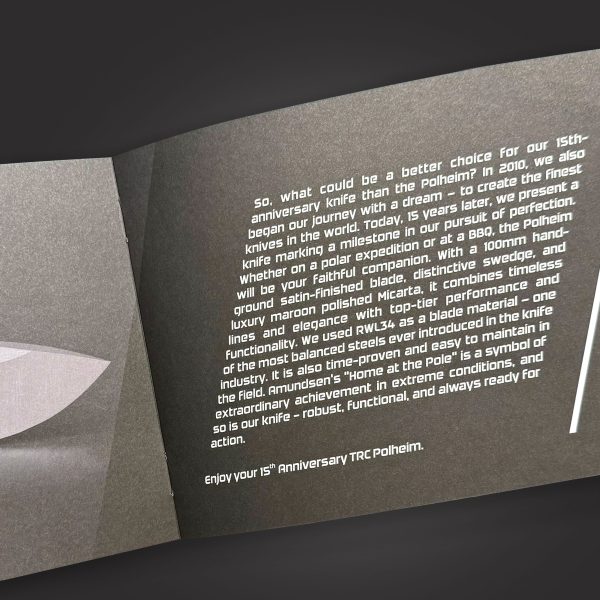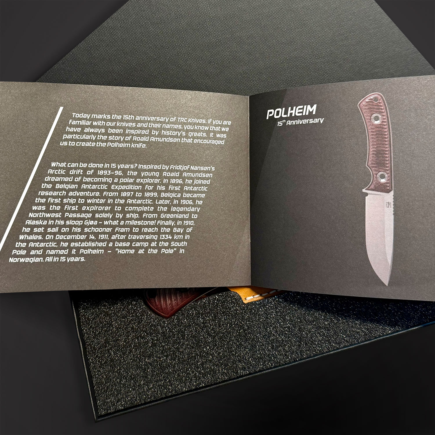 TRC Knives Polheim 15th Anniversary Edition Knife. Polheim – “Home at the Pole” designed and manufactured to perform various tasks in the field. Its name emphasizes its very utilitarian character and its design and features confirm its universality.