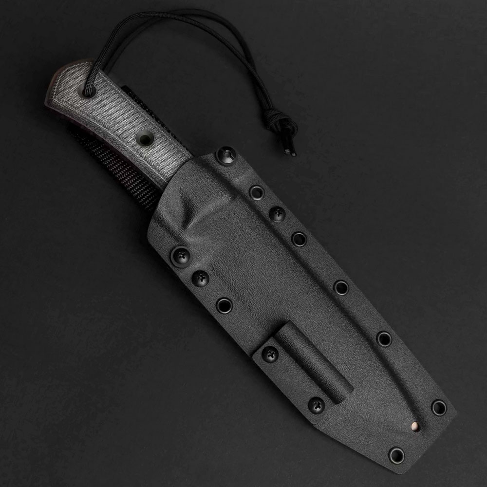 Knife comes with holster made of hand-formed black Kydex material, which we attach to the belt with a grommet made of durable, heavyweight nylon. The handle made of this material gives flexibility, which, for example, when squatting or bending, is arranged in a way that limits the occasional burdensome squeezes or body cuts. To facilitate the removal of the knife, which fits very well in the tight-fitting material, a thumb support has been planned, thanks to which the knife can be removed in a controlled and safe manner. Kydex itself is a very durable material that is characterized by high resistance to impacts, scratches, low moisture absorption, resistance to various weather conditions and many chemicals. We use holsters made of it comfortably and for a long time. The holster is equipped with pass-through pins to which you can attach, for example, a flint holder (not included in the set) or use them to attach it to a backpack, harness element or Molle type solution.