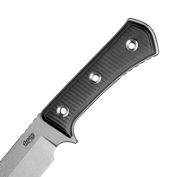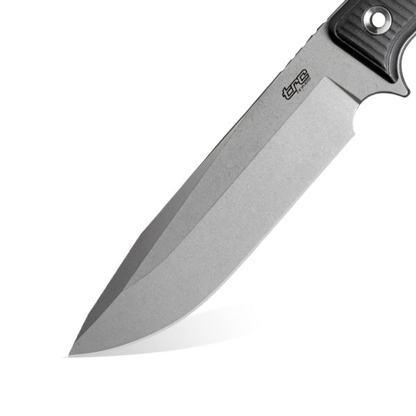 TRC Knives Apocalypse Stonewashed Double Black Canvas Micarta in new version, with a stonewash-finished blade in a gray hue, complementing the classic black handle made from a special variant of original Micarta. As it is known, the standard black Micarta, originally developed in the United States, despite its color name ‘black,’ contains shades of gray and black with varied tonality. Double Black Canvas Micarta is characterized by a pure color tone, similar to black G10 composite, but it is lighter and certainly appeals to individuals who do not simply prefer G10.