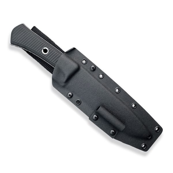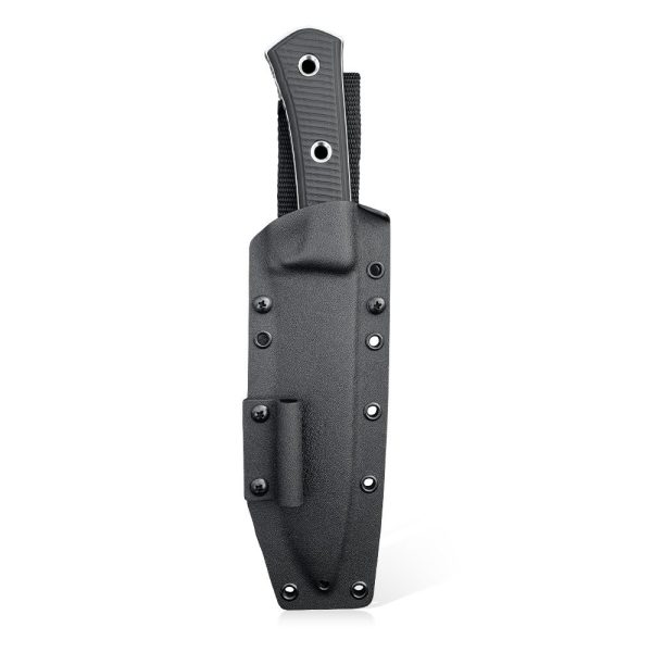 Knife comes with holster made of hand-formed black Kydex material, which we attach to the belt with a grommet made of durable, heavyweight nylon. The handle made of this material gives flexibility, which, for example, when squatting or bending, is arranged in a way that limits the occasional burdensome squeezes or body cuts. To facilitate the removal of the knife, which fits very well in the tight-fitting material, a thumb support has been planned, thanks to which the knife can be removed in a controlled and safe manner. Kydex itself is a very durable material that is characterized by high resistance to impacts, scratches, low moisture absorption, resistance to various weather conditions and many chemicals. We use holsters made of it comfortably and for a long time. The holster is equipped with pass-through pins to which you can attach, for example, a flint holder (not included in the set) or use them to attach it to a backpack, harness element or Molle type solution.