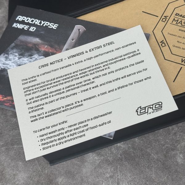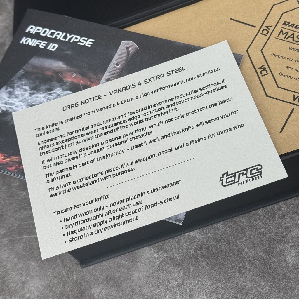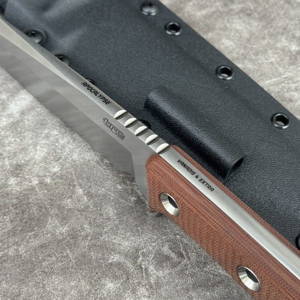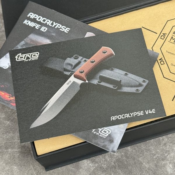- The presented Limited Edition is the most robust version of the Apocalypse released to date. At its core is Vanadis 4 Extra steel, known for outstanding performance under stress, high wear resistance, and exceptional edge retention. The design is completed with a handle made from natural micarta (Natural Canvas Micarta) in honey/light brown tones*. The knife comes with a black Kydex sheath equipped with a ferro rod holder. Only 200 numbered pieces are planned for this series — not a large quantity considering the scale of the Lithuanian manufacturer.